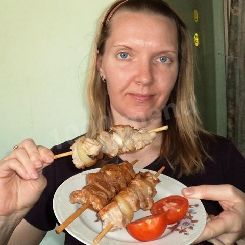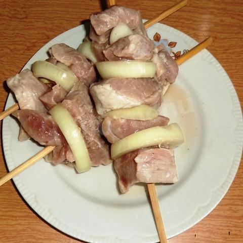 nawlecz 3-4 kawałki mięsa na bambusowe szaszłyki, naprzemiennie z cebulą. Smażyć na średnim ogniu, w niewielkiej ilości oleju roślinnego z jednej strony, odwrócić, przykryć i usmażyć z drugiej strony. Zdejmij pokrywkę i możesz przytrzymać ją jeszcze przez minutę, aby nadmiar płynu wyparował. Ale nie długo, aby mięso nie wyschło! Szaszłyki cielęce są gotowe, podawaj raczej na stole, aż jedzenie ostygnie. I niech sąsiedzi zyskają, śliniąc się nad zapachami z twojego okna!