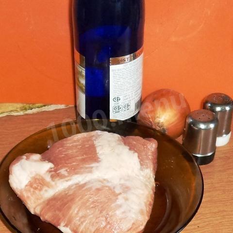 pokrój mięso w kostkę, około 4x4 cm lub nieco mniejsze. Pokrój cebulę w pierścienie, zalej wrzącą wodą przez 1-2 minuty, a następnie spuść wodę. Cebulę i mięso włożyć do rondla, posolić i pieprzyć, w razie potrzeby dodać inne przyprawy, zalać winem, wymieszać, przykryć i pozostawić do marynowania na co najmniej 3 godziny.