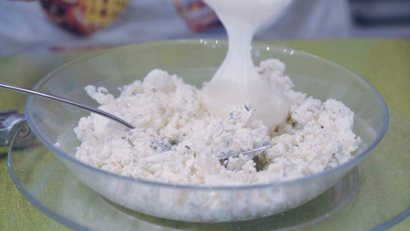 Przygotowujemy niezbędne produkty do przygotowania pysznych bułek z bakłażanem z nadzieniem i przygotowujemy ostatni, dodając do talerza dwieście gramów twarogu jedną łyżeczkę mieszanki koperku, kolendry, pietruszki, trzy ząbki czosnku przepuszczone przez prasę.