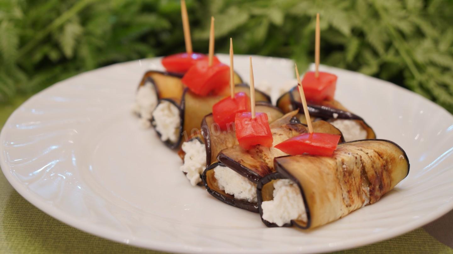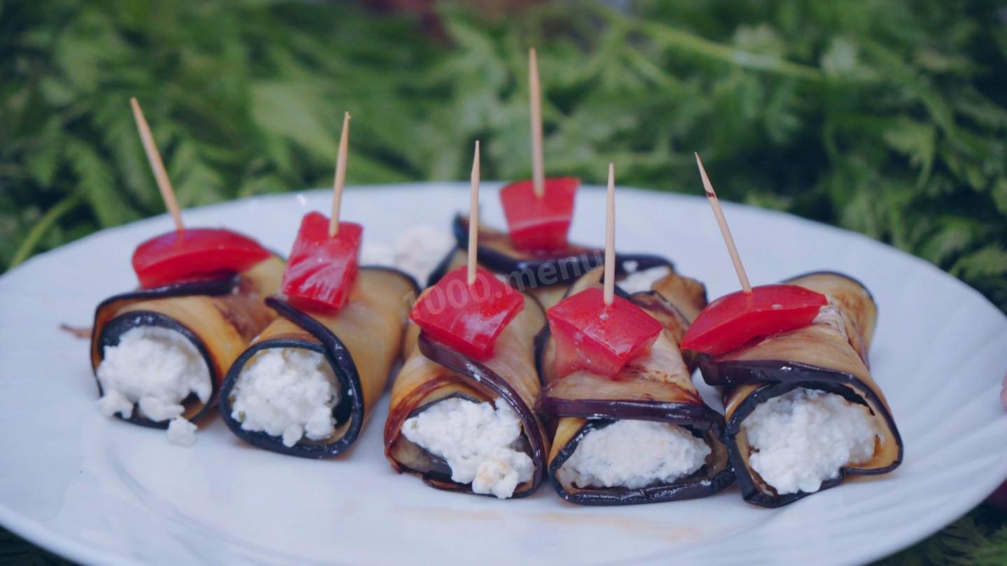 Bakłażany zwinięte w bułki z nadzieniem twarogowym dekorujemy kawałkiem pomidora i mocujemy wykałaczką lub szpikulcem.