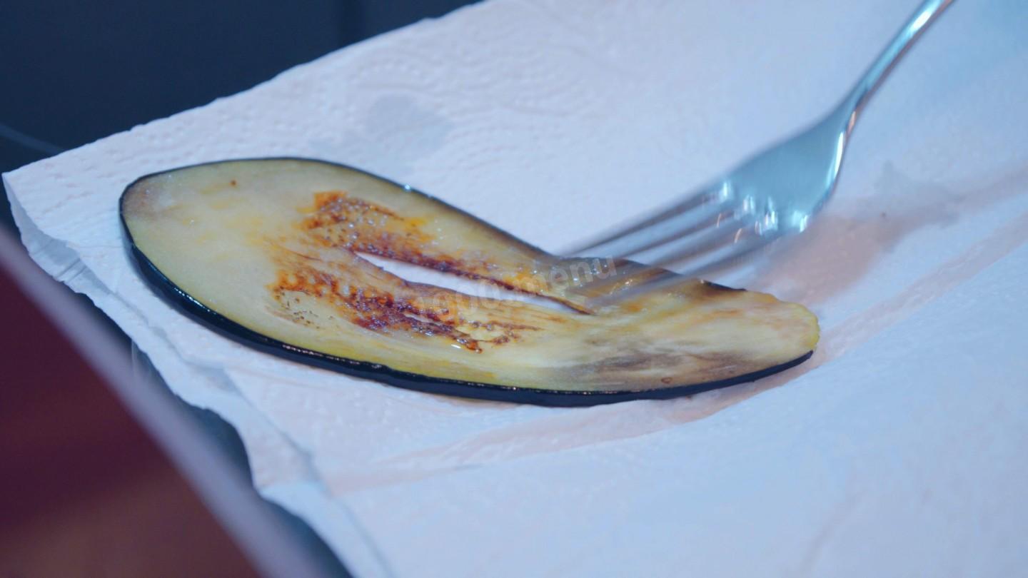 Połóż smażone talerze z bakłażana na papierowej serwetce, która pozwoli im ostygnąć i uwolnić się od nadmiaru tłuszczu.