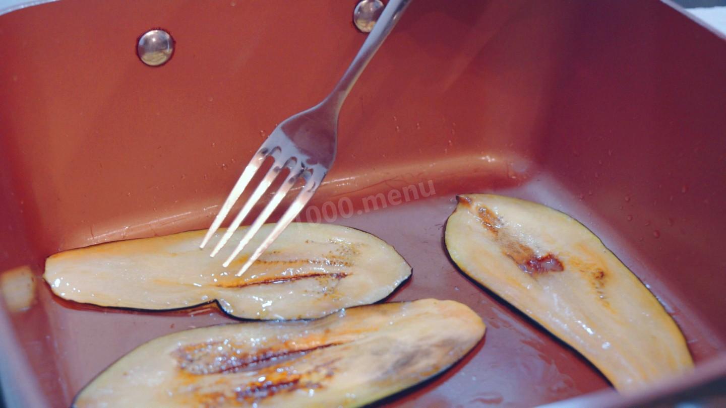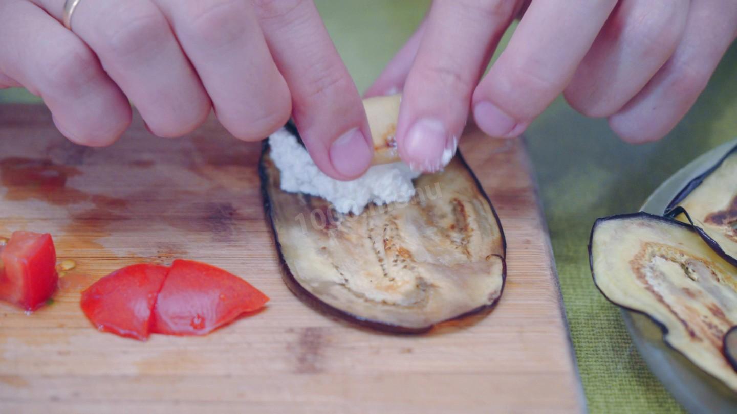 Ugotowane nadzienie twarogowe umieszcza się na każdym talerzu z bakłażanem i ostrożnie zawija w bułki.