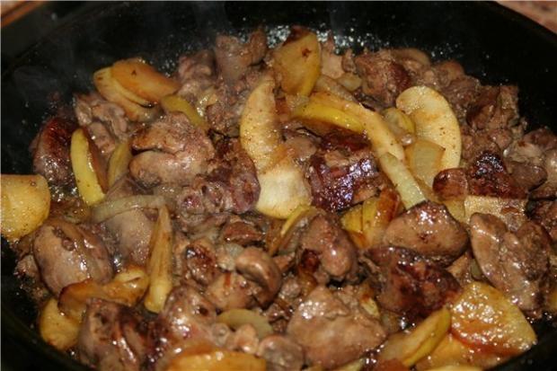 nasze wnętrzności są spawane. Teraz kroimy je na kawałki i wrzucamy na patelnię do naszego smażenia. Tutaj dodajemy jabłko, powinno być słodko-kwaśne i pokrojone w plasterki,wszystkie nasze przyprawy, czosnek i ocet. Dusić przez kolejne piętnaście minut. Podawaj takie danie na gorąco.