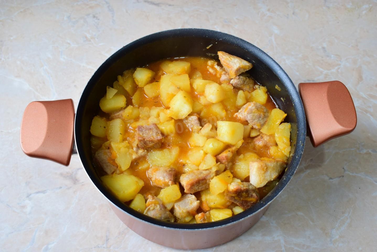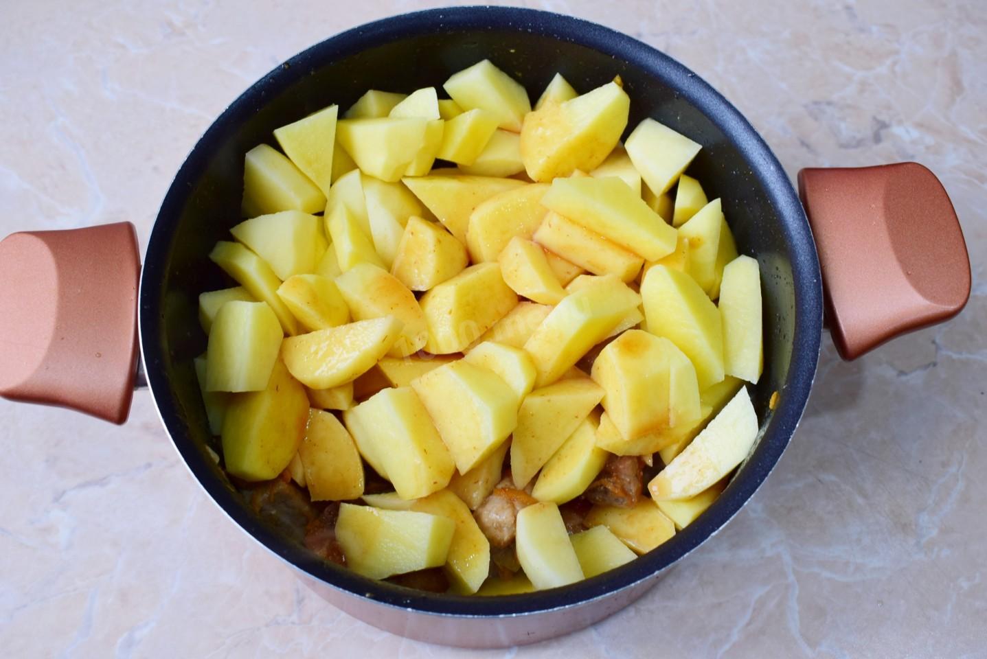 Na patelnię włożyć pokrojone ziemniaki i wlać sos pomidorowy. Do smaku dodaj sól i przyprawy. Dodaj gorącą wodę, aby znajdowała się nieco poniżej poziomu ziemniaków. Wymieszaj, przykryj i gotuj na małym ogniu przez 20-25 minut. Ziemniaki staną się miękkie.