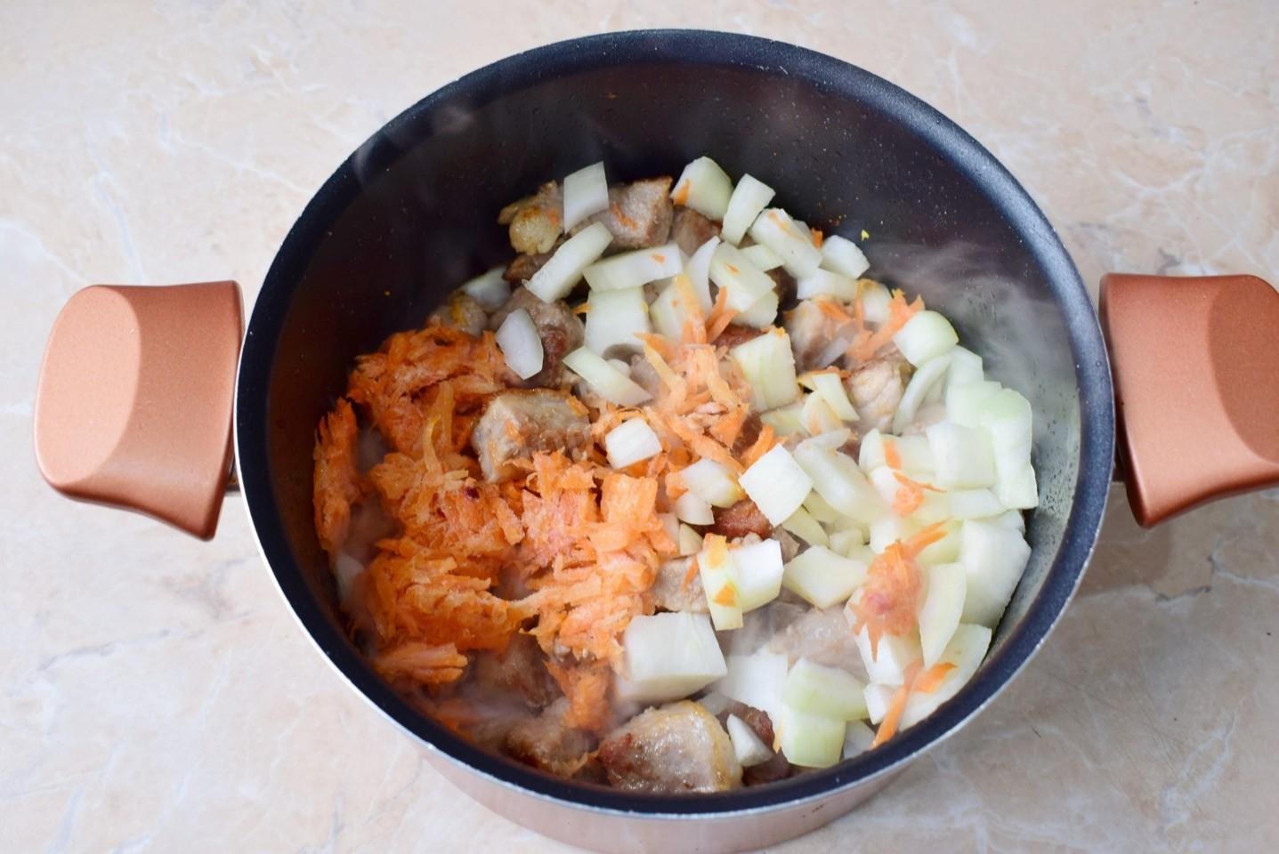 Obierz i posiekaj cebulę i marchewkę. Drobno posiekaj cebulę i zetrzyj marchewki. Dodaj cebulę i marchewkę do garnka. Wszystko wymieszaj i smaż wszystko razem przez kolejne 4-5 minut. Z warzyw pojawi się charakterystyczny smażony armoat.