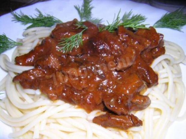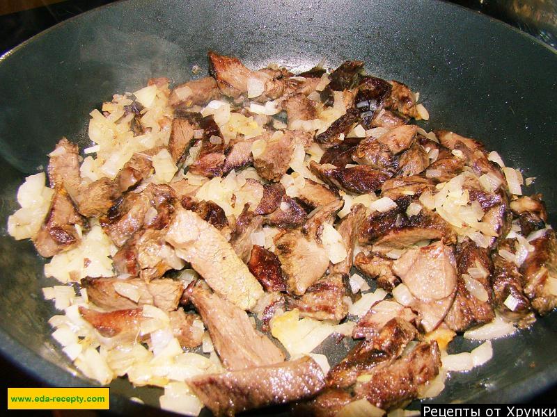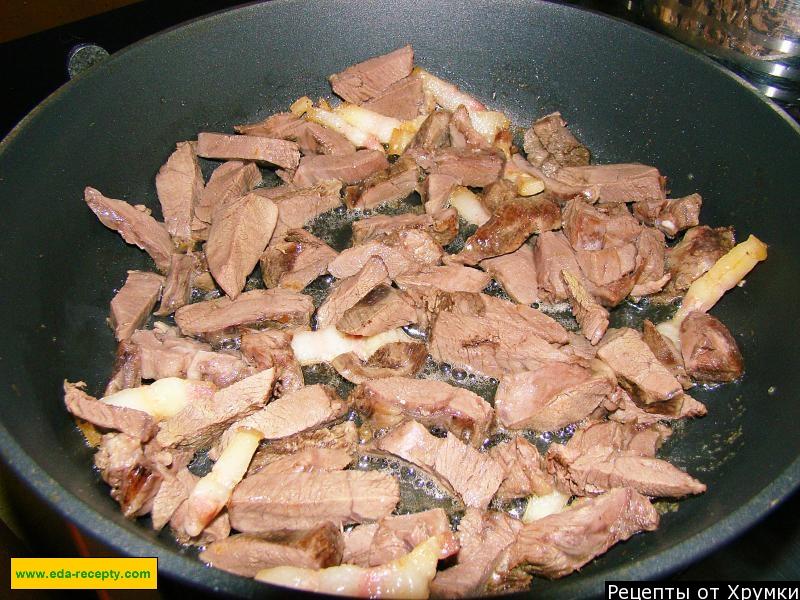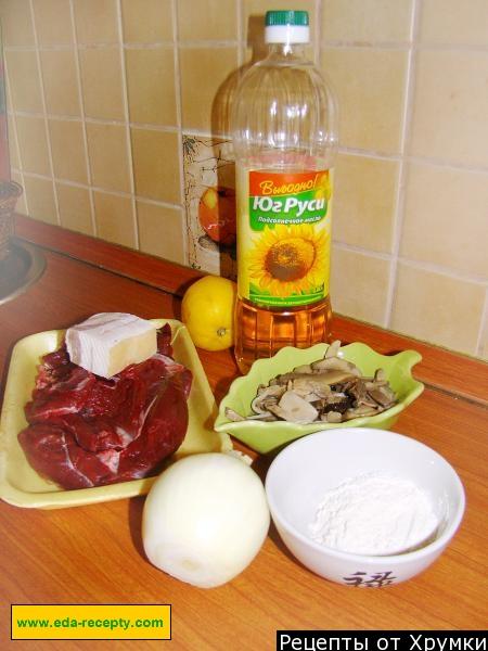 następnie, gdy mięso zrumieni się ze wszystkich stron, posyp je przesianą mąką, zalej wrzącą wodą i gotuj przez kilka minut. Następnie przenosimy mięso do innego rondla, w tym samym miejscu wlewamy sos przecedzony przez gazę. Następnie solone lub marynowane grzyby (wziąłem pieczarki) myjemy zimną wodą i smażymy na maśle, po czym zalewamy pieczarki sokiem z cytryny, wkładamy do rondla z wołowiną i mieszamy. Dusić całą masę do miękkości.