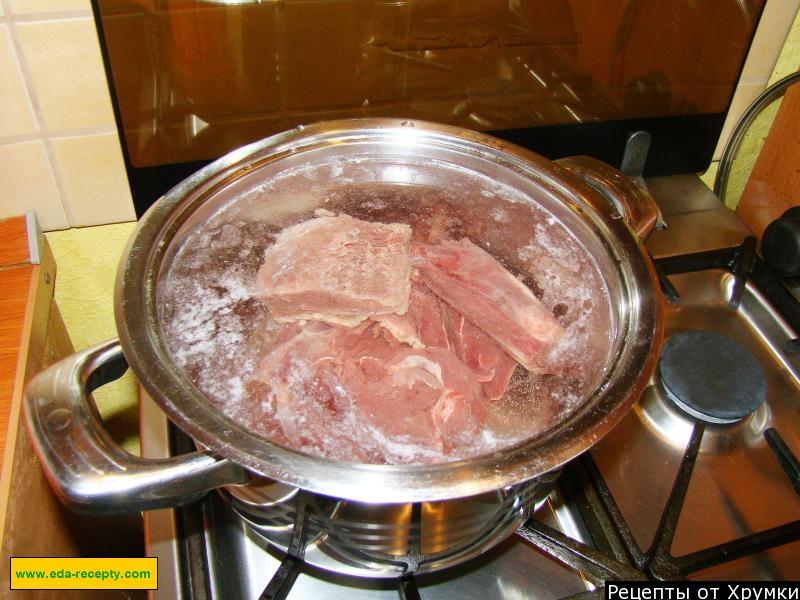 zaczynamy więc od ugotowania kawałka umytej wołowiny do miękkości. Następnie włóż kawałek gotowanego mięsa, cebulę, kilka kawałków boczku i roztopione masło do średniej wielkości rondla. Przykryj patelnię pokrywką i umieść na małym ogniu.