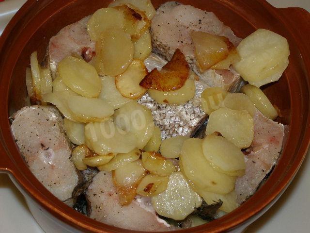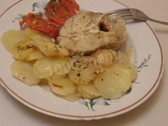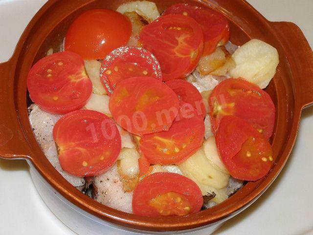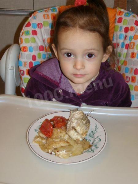 połóż dorsza na cebuli. Umyj pomidory, a także pokrój w kółka. Przykryj je kawałkami ryby na patelni i posyp solą i pachnącymi przyprawami. Aby ryba była bardziej soczysta, dodaj 4 łyżki wody. Przykryj kawałki ryby smażonymi ziemniakami, przykryj patelnię pokrywką i włóż do nagrzanego piekarnika na pół godziny.