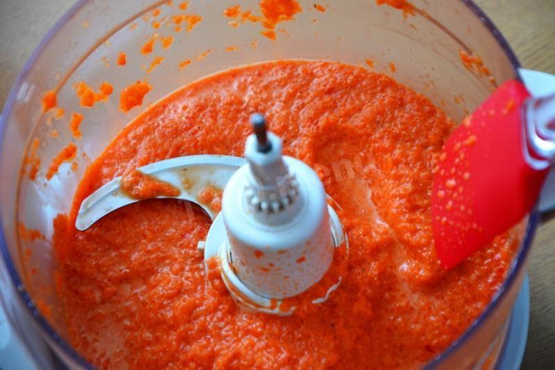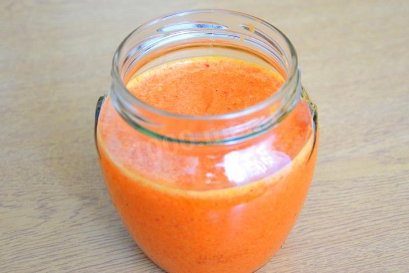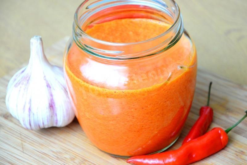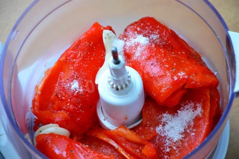 paprykę wysyłamy do pieczenia w piekarniku lub na otwartym ogniu na kuchence. Smażyć na czarną skórkę. Smażona papryka jest wysyłana do gęstej torby lub do garnka z gęstą pokrywką, aby się pocić, dzięki czemu znacznie łatwiej będzie usunąć skórkę. Pozwól papryce ostygnąć i obierz skórę i nasiona. Do miski kombajnu wysyłamy chili (możesz dodać więcej mniej, skup się na swoim smaku), czosnek, paprykę, sól, cukier i czarny pieprz, wszystko ubijamy stopniowo dodając olej. Gotowy sos wysyłamy do lodówki na godzinę. Ten sos doskonale nadaje się do mięsa, drobiu.