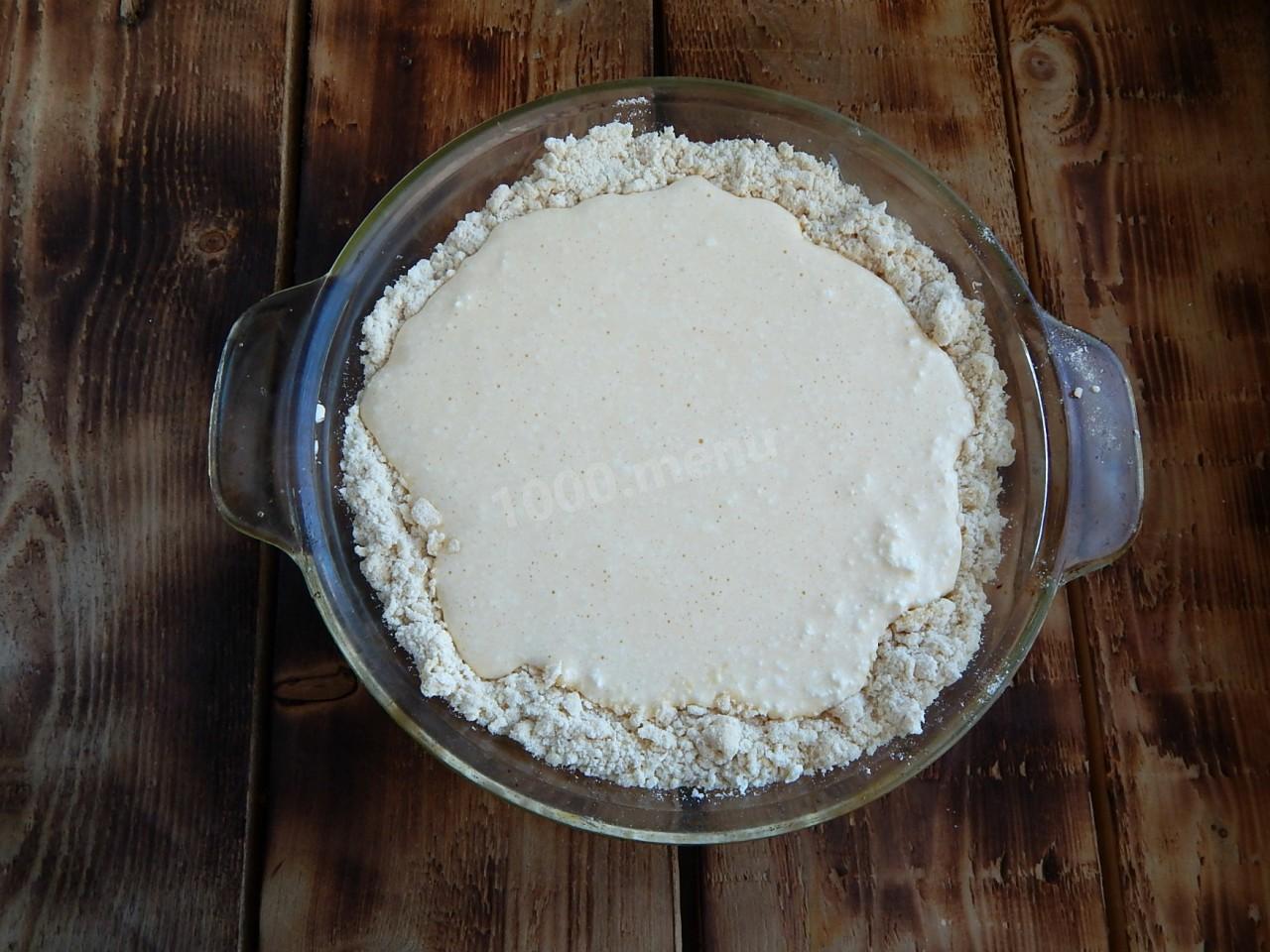 Nasmaruj formę do pieczenia ciasta masłem (boki i spód). Dwie trzecie okruchów piasku układamy w formie, tworząc boki ciasta. Rozłóż nadzienie twarogowe na środku ciasta. Nie powinien być zbyt płynny, a jednocześnie suchy, dlatego podczas jego przygotowania konsystencję należy zmienić, używając i dodając ciężką śmietanę.