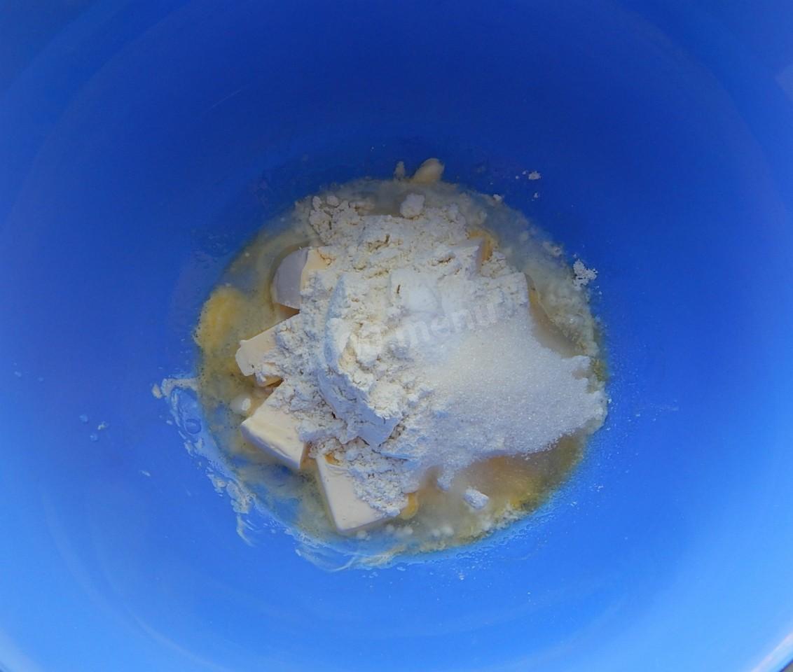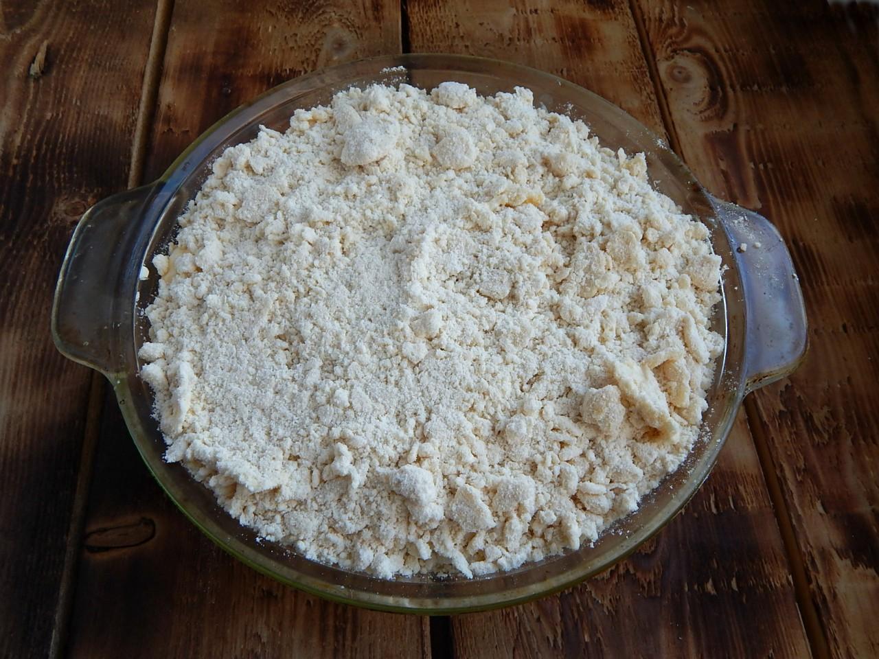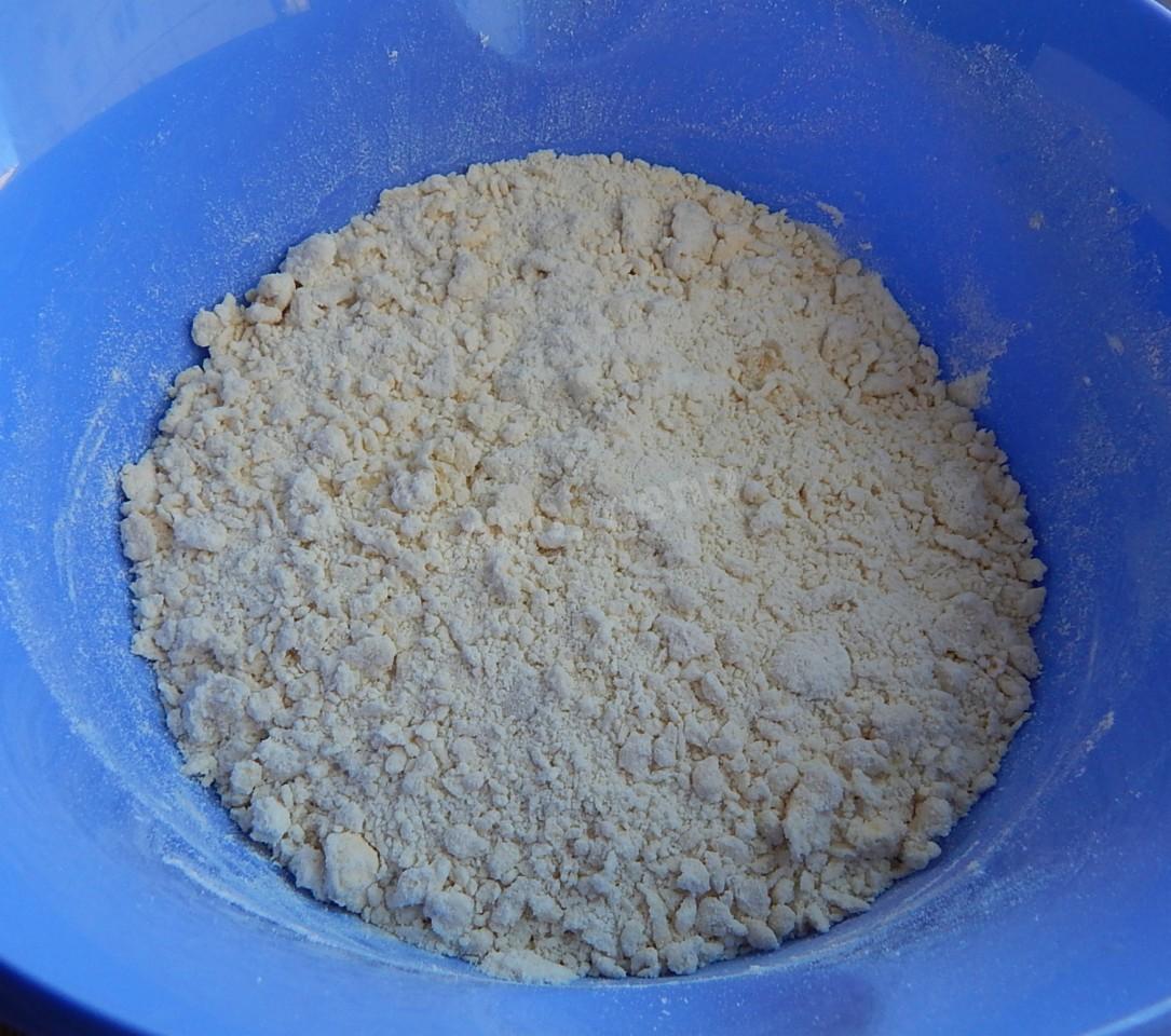 Dodaj mąkę pszenną do miski, przesianą i połączoną z proszkiem do pieczenia i szczyptą waniliny. Wymieszaj składniki i rozetrzyj ciasto na okruchy. Ciasto jest gotowe.