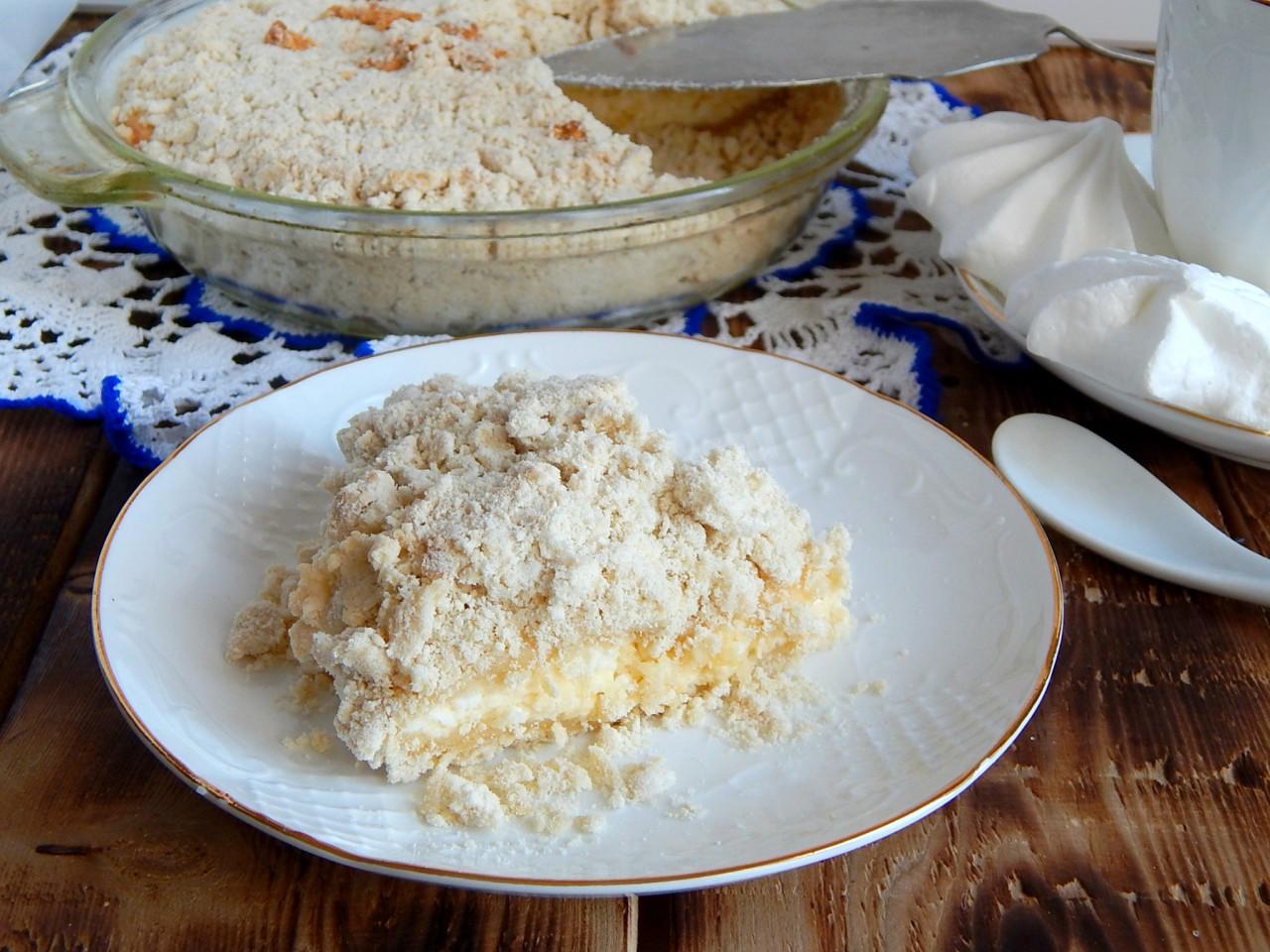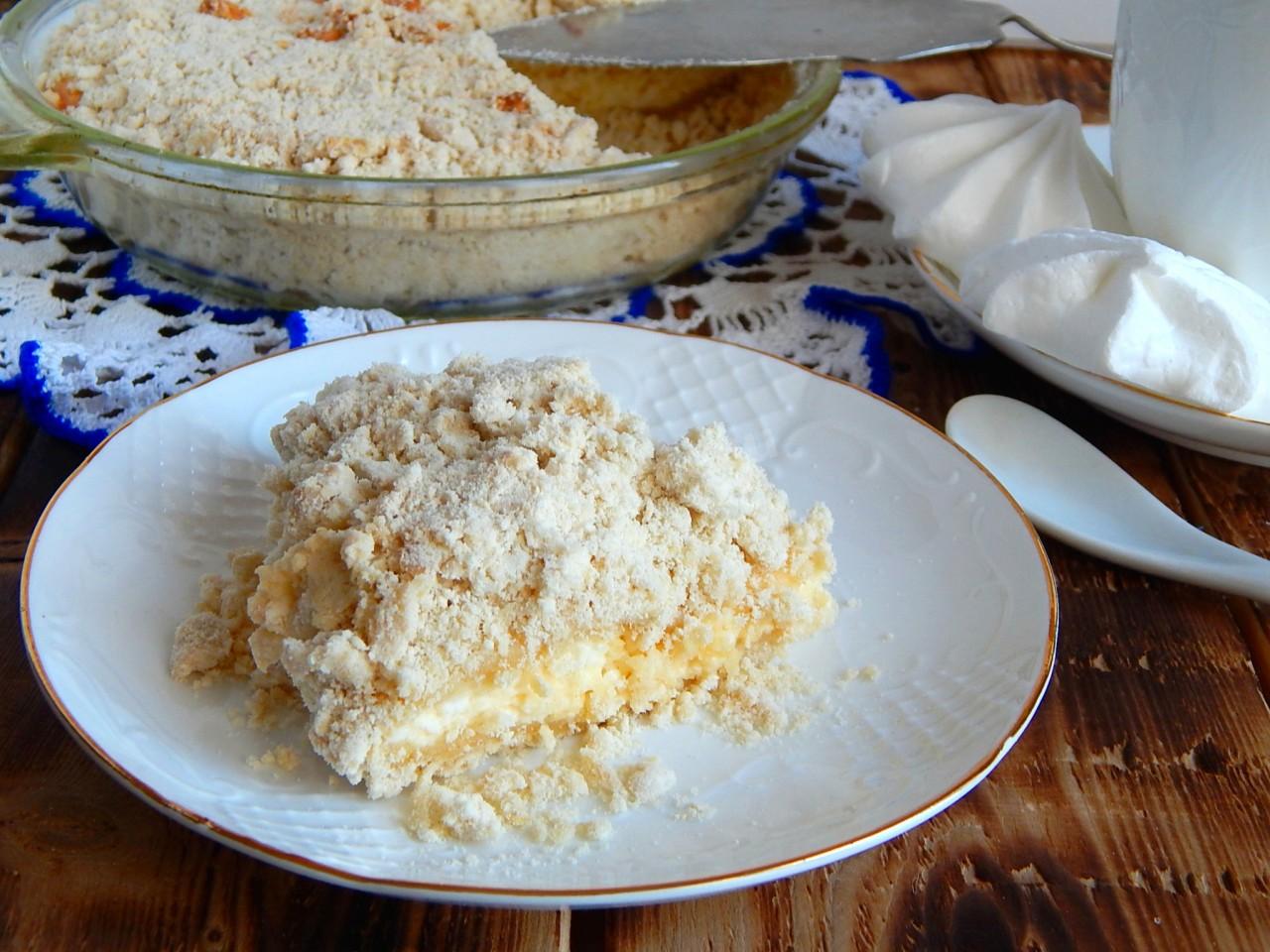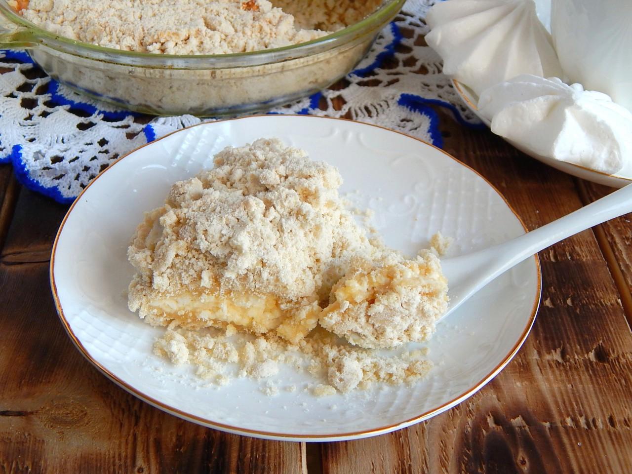 Posyp nadzienie resztkami ciasta kruchego, wyrównaj okruchy piasku, aby powierzchnia ciasta była równa bez zjeżdżalni. Piekarnik rozgrzewa się do 180 stopni. Piec ciasto przez około 30 minut, musisz skupić się na pracy piekarnika, wielkości formy i objętości ciasta. Ciasto powinno być lekko zrumienione na wierzchu, upieczone w środku.
