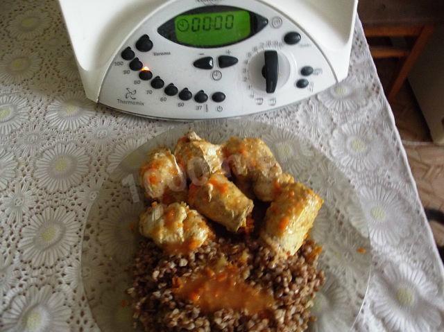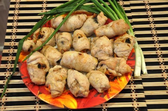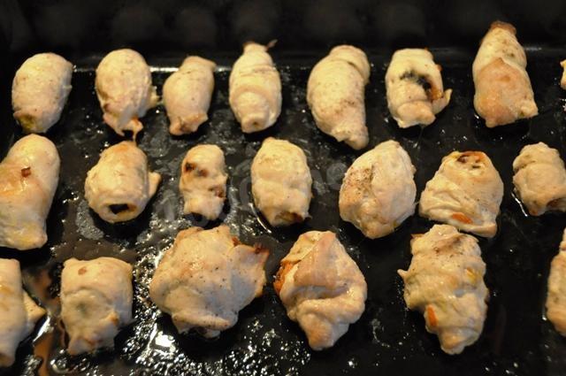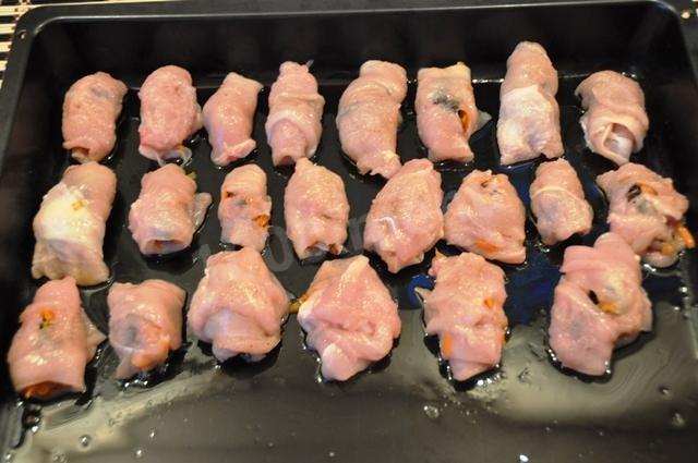 Włóż łyżkę podsmażacza i jedną suszoną śliwkę do fileta ze strusia, zawiń rolkę i dźgnij wykałaczką.
