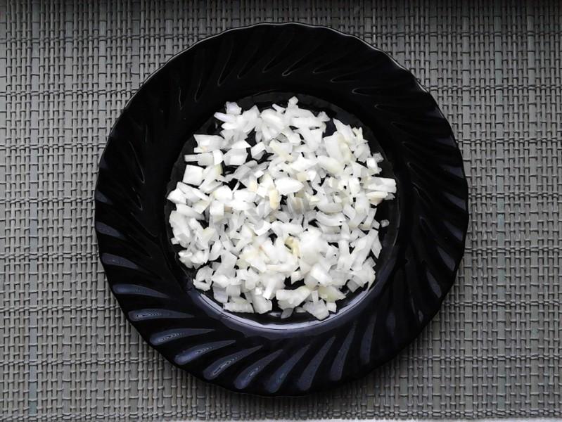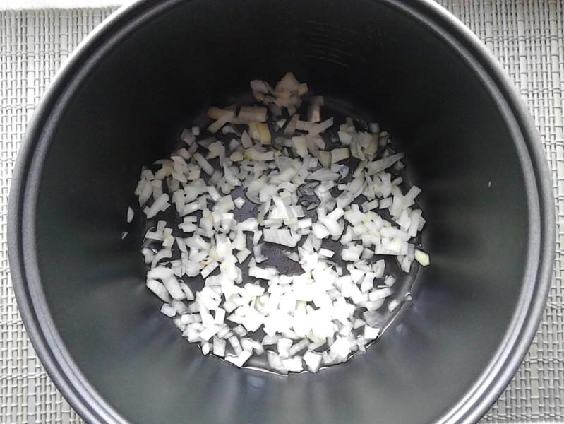 Zacznij robić risotto. Wlej olej słonecznikowy do miski wolnowaru i włóż posiekaną cebulę. Smaż cebulę przez 3 minuty w trybie "smażenia".