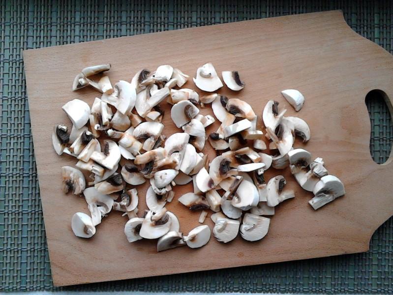 Oczyść pieczarki z folii i pokrój na małe kawałki.