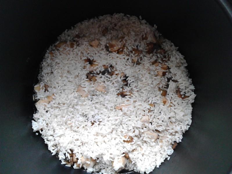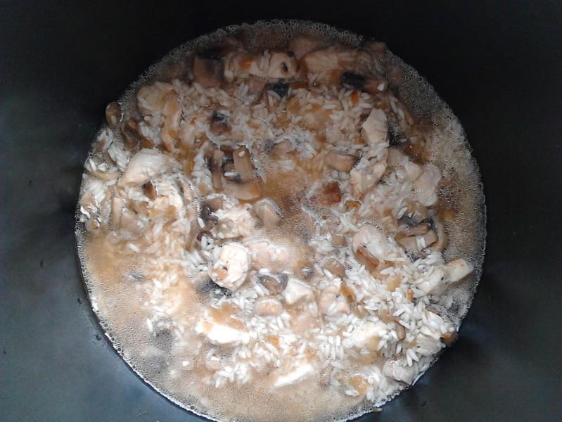 Dodaj umyty ryż i wino do wolnowaru i w trybie "smażenia" odparuj wino (4 minuty).