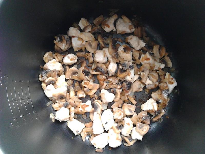 Włóż kurczaka pokrojonego na kawałki do miski multicookera i kontynuuj smażenie w trybie "smażenia"przez kolejne 7 minut.