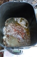 Dodaj nasiona dyni, słonecznika, siemię lniane. Dodałem mieszankę fitness Mick, są różne nasiona i suszona marchewka. Wlej serwatkę lub wodę i olej roślinny