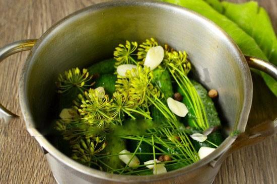 4. Umieść ogórki w czystym rondlu, przeplatając je ziołami i czosnkiem.