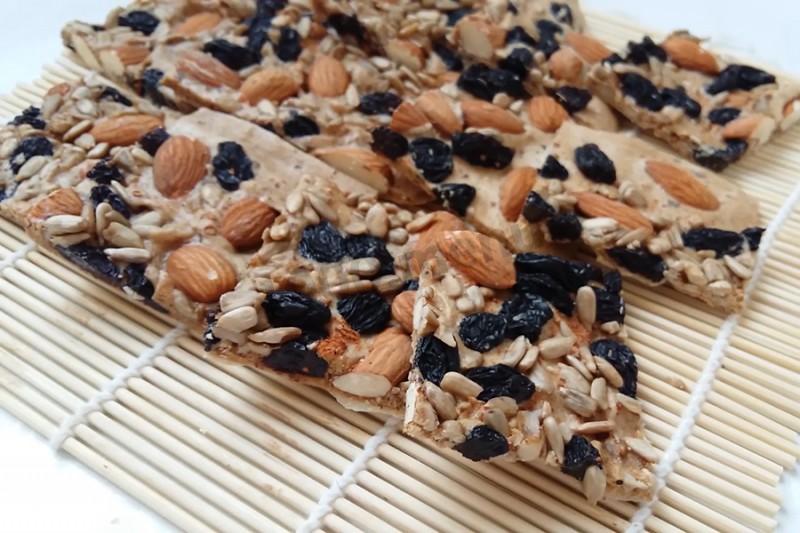 7. Rozłóż równomiernie mieszankę orzechów, nasion i rodzynek.