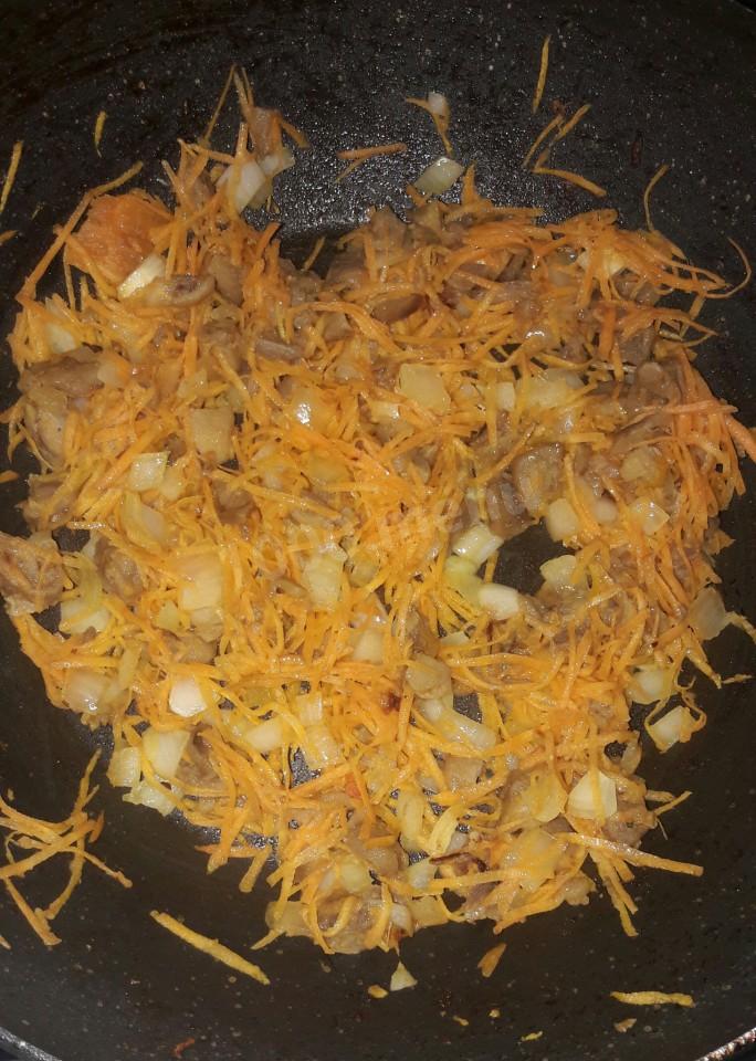 Pokrój cebulę w półpierścienie, pokrój pieczarki w kostkę, pokrój marchewki w cienkie paski. Smażyć grzyby na niewielkiej ilości oleju roślinnego, a następnie dodać cebulę, po minucie marchewkę. Smaż jeszcze minutę, dwie.
