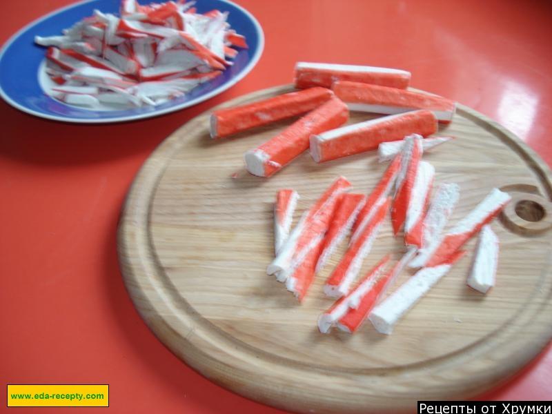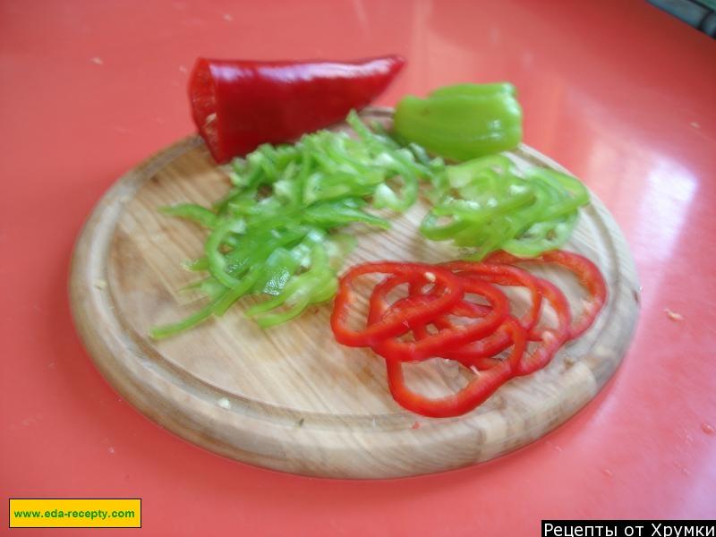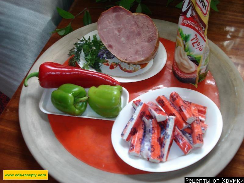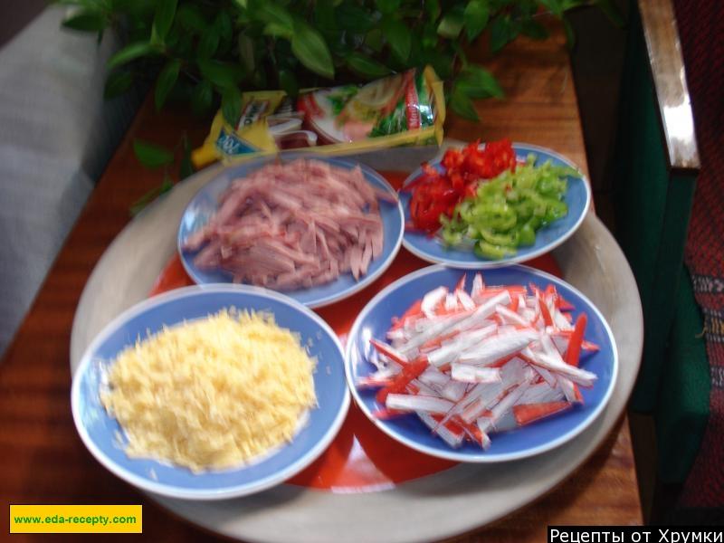 pokrój paluszki krabowe i szynkę w paski. Zetrzyj ser na grubej tarce, pokrój paprykę na pół pierścienia.