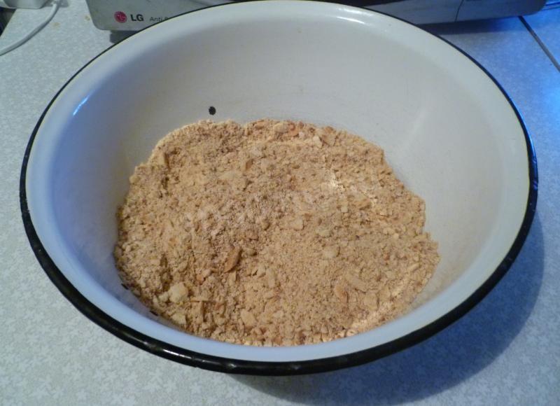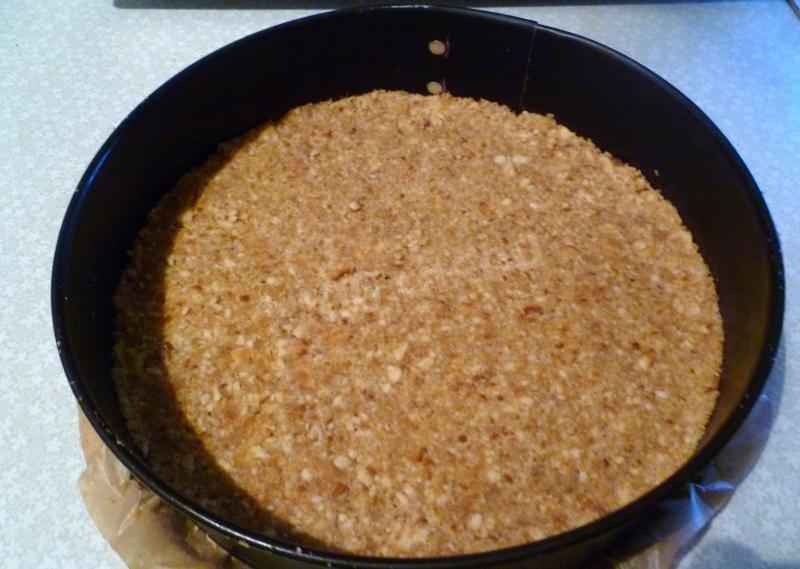 posiekaj ciasteczka na okruchy, wlej roztopione masło, wymieszaj.