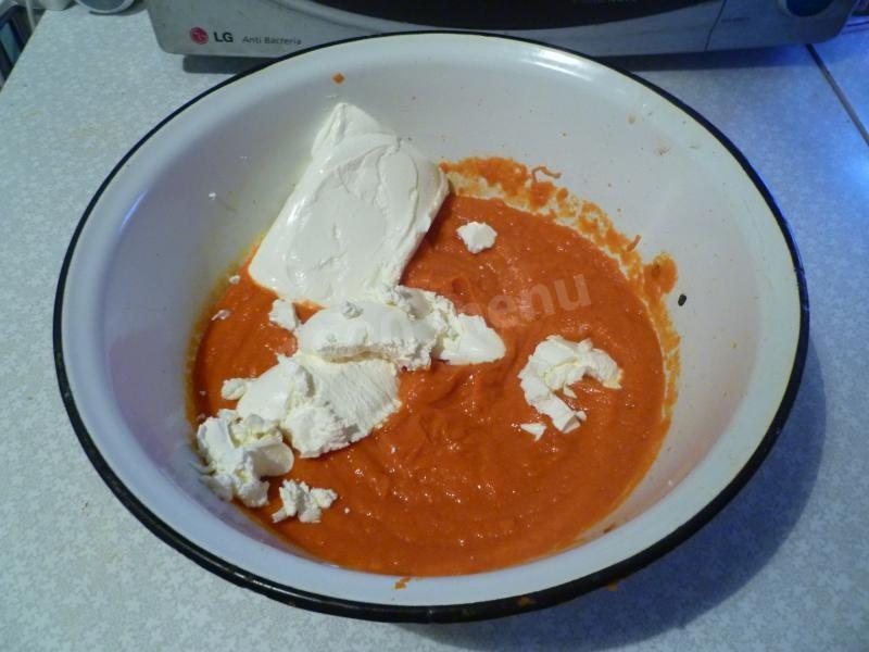 obierz go ze skórki i ubij miąższ w blenderze. Włóż ser twarogowy, cukier w proszku i wymieszaj w mikserze (z małą prędkością).