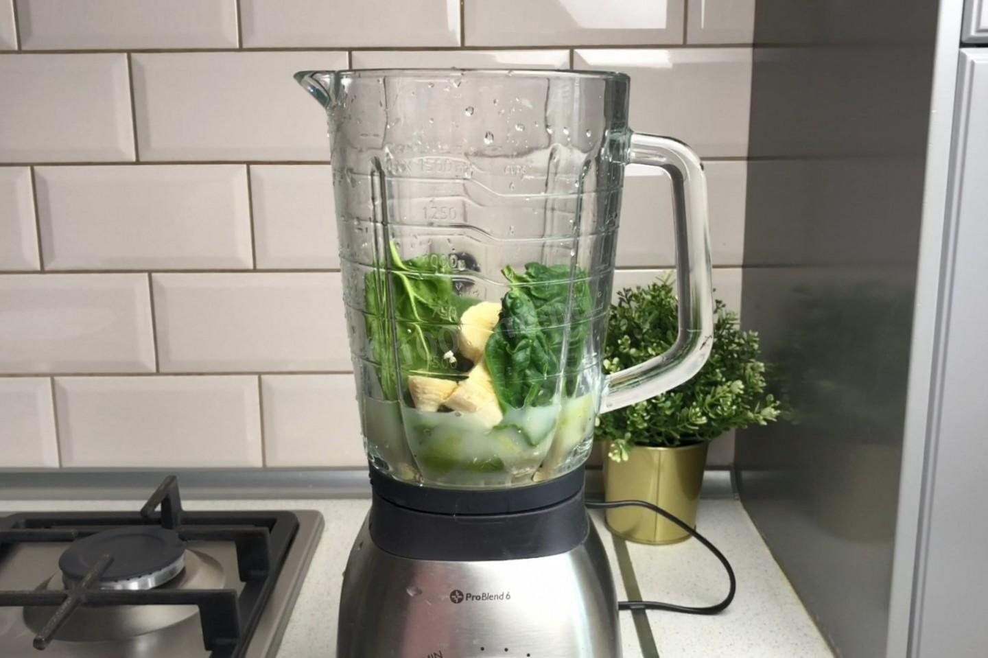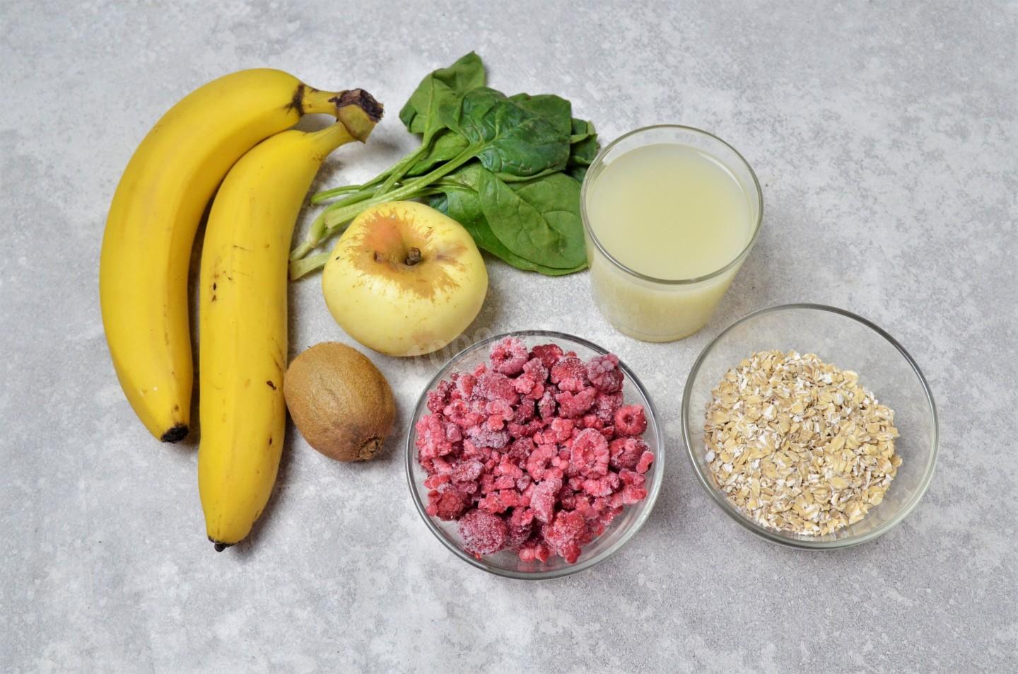 Na zielony koktajl wlej mleko, dodaj płatki, włóż Banana, jabłko, kiwi i szpinak. Ubij smoothie w ten sam sposób.