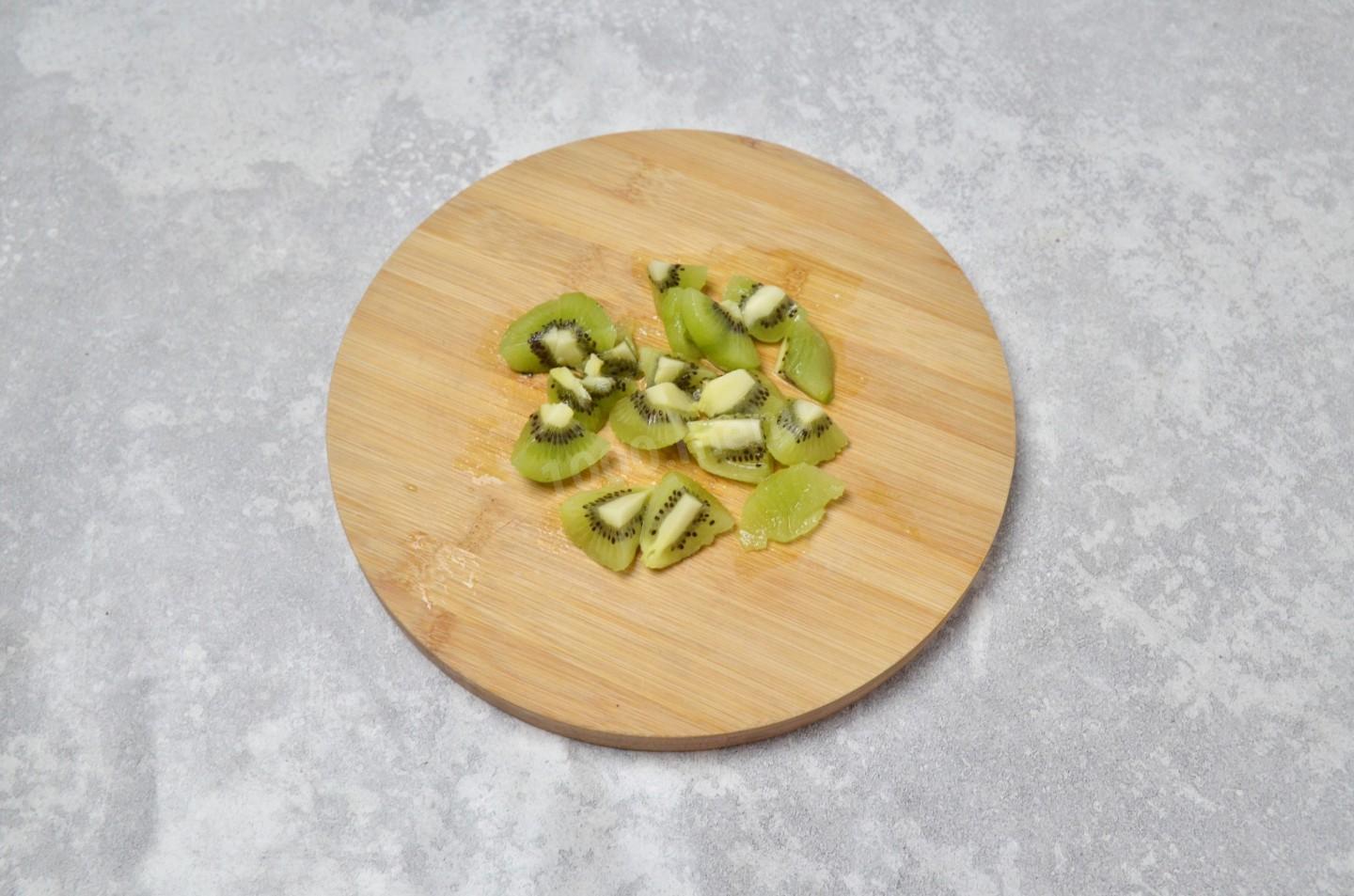 Kiwi umyć, osuszyć i pokroić na pół. Łyżką wyjmij miąższ i pokrój go na kawałki.