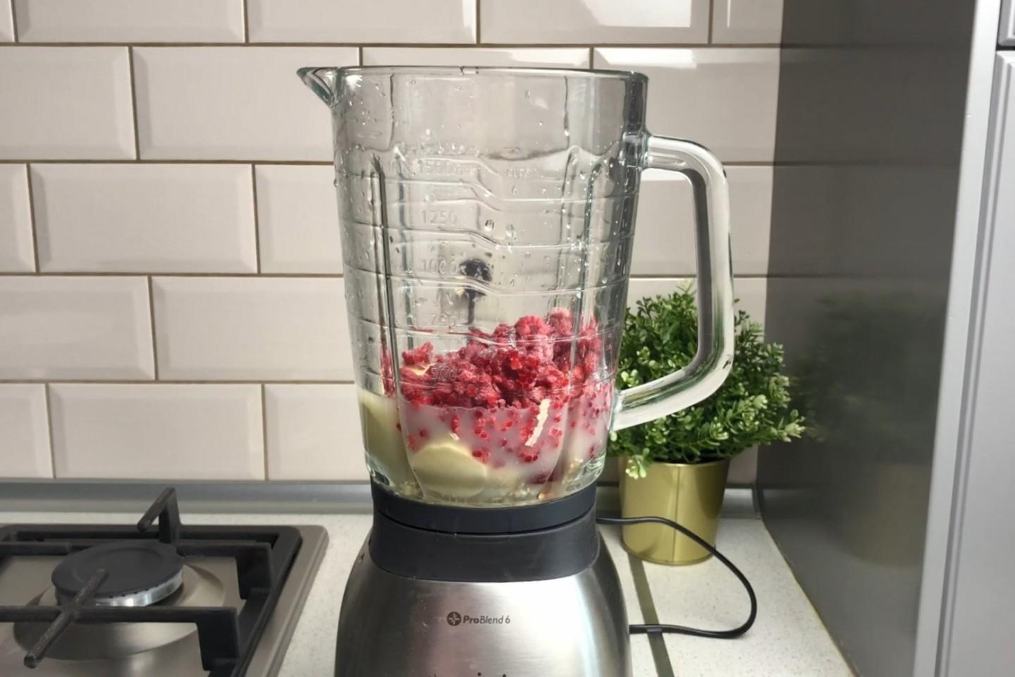 W przypadku koktajlu malinowego wlej również szklankę mleka, włóż płatki, jabłko, banana i dodaj maliny. Mam mrożoną jagodę, ale możesz wziąć świeżą. Ubij smoothie w podobny sposób, aż będzie gładkie.