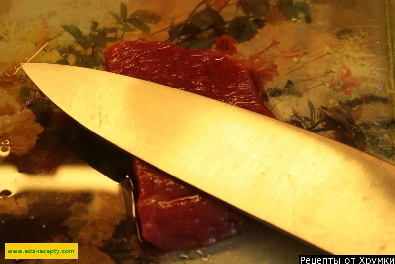 pokrój filet wołowy na cienkie plasterki. I nie bij ich, ale dociśnij je do deski grzbietem noża. Wtedy włókna nie pękną.