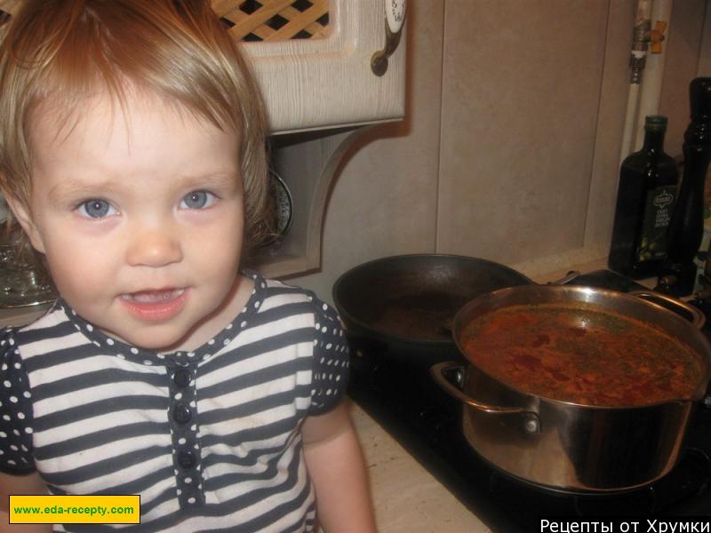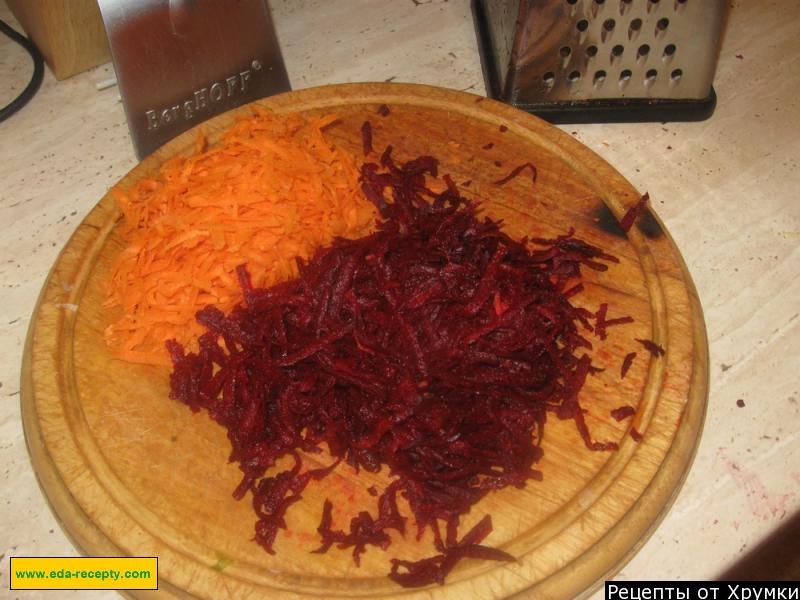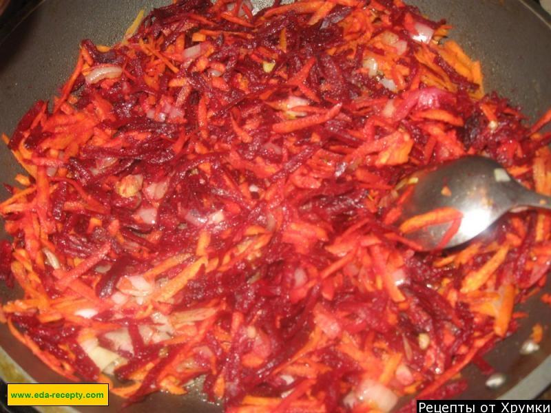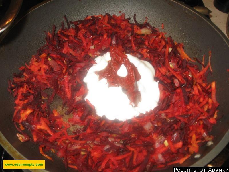 a tymczasem robię smażenie. Drobno posiekaj cebulę, pocieram marchewkę i buraki na grubej tarce i smaż wszystko na oleju słonecznikowym. Na koniec dodaję koncentrat pomidorowy ze śmietaną. Wolę też dodać ząbek czosnku. Jeśli gotujesz