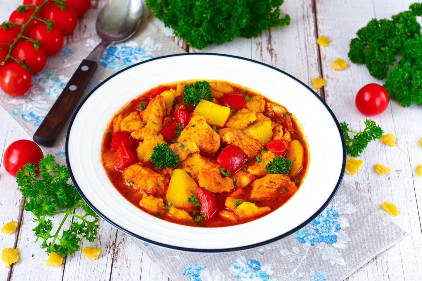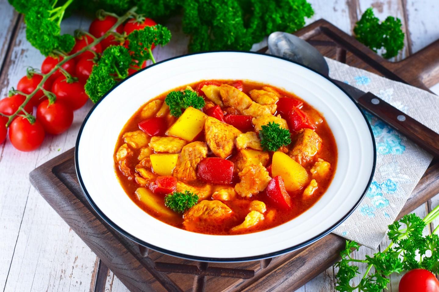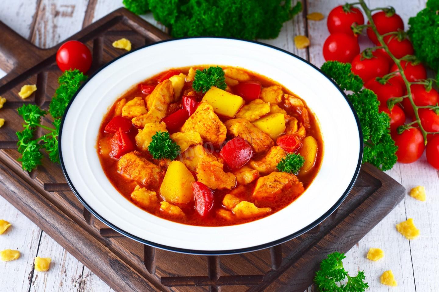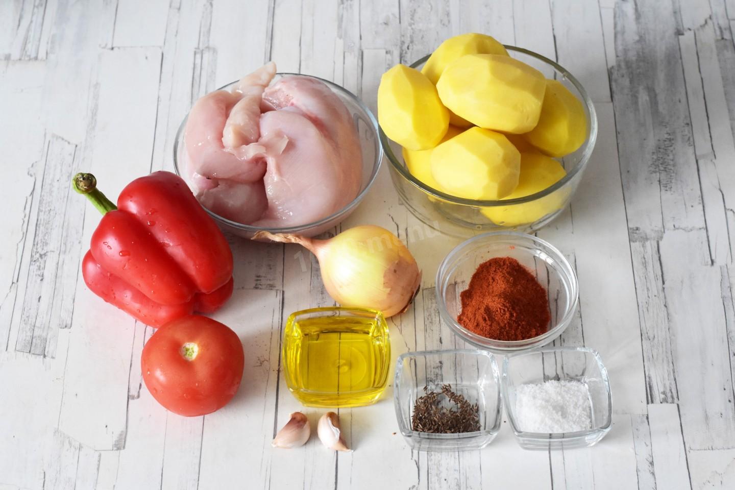 Jak zrobić gulasz z kurczaka z sosem pomidorowym i frytkami na patelni? Aby rozpocząć, przygotuj niezbędne składniki zgodnie z listą. Możesz wziąć paprykę w dowolnym kolorze. Filet z kurczaka można zastąpić wołowiną lub wieprzowiną. Pamiętaj jednak, że czas gotowania i zawartość kalorii ulegną zmianie. Możesz wziąć dowolny olej roślinny. Mam Słonecznik. W razie potrzeby możesz w ogóle nie dodawać kminku lub zastąpić go przyprawami do smaku.