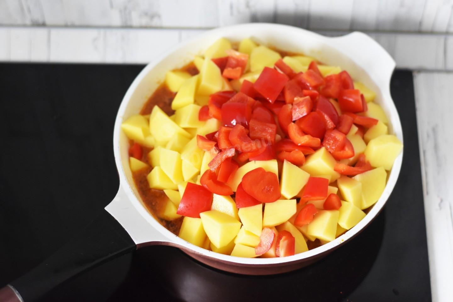 Dodaj ziemniaki i paprykę. Wlej około 50 ml gorącej wody i gotuj wszystko razem przez 10 minut.