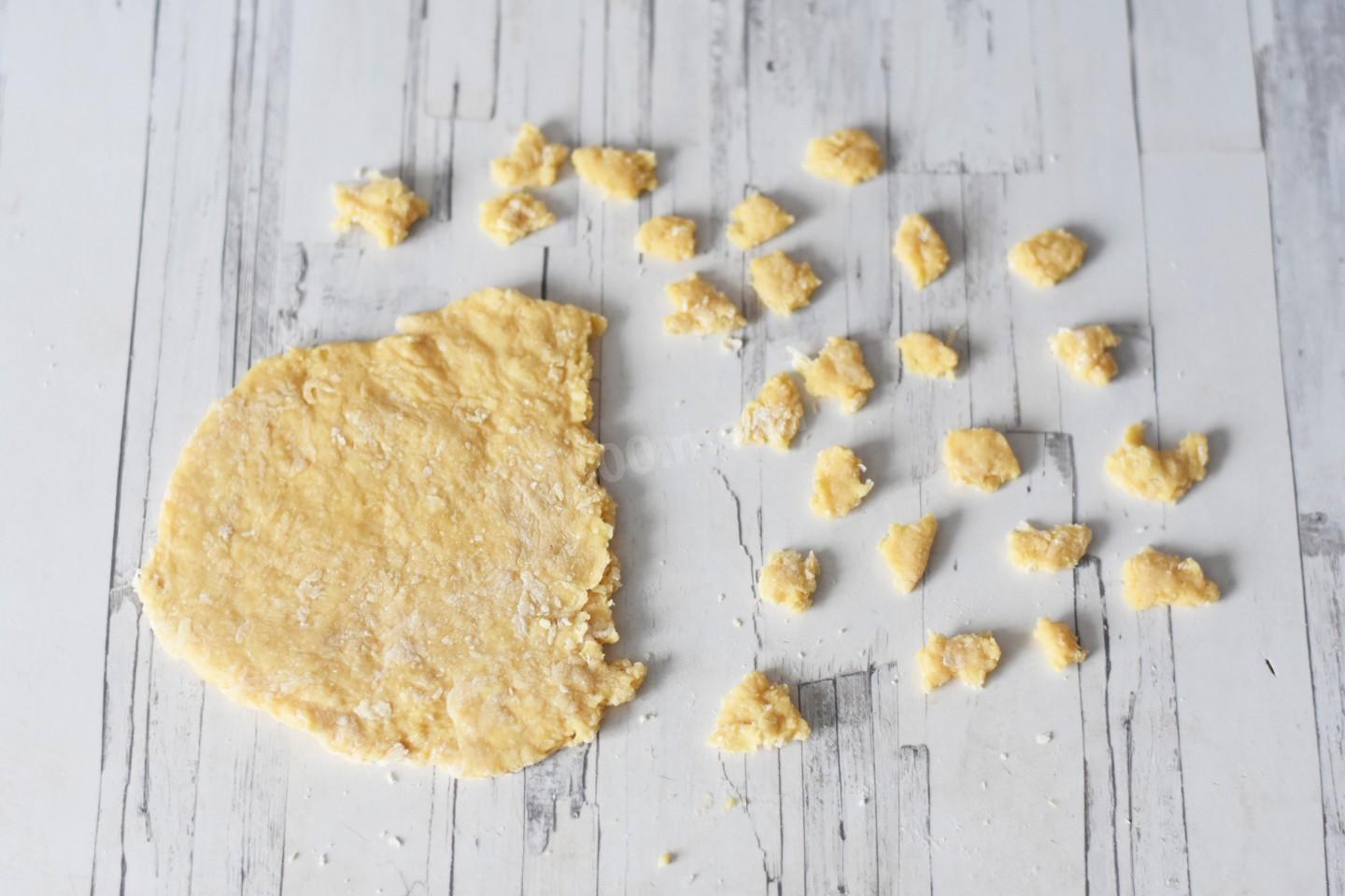 Wymieszaj jajko, mąkę i sól i ugniataj twarde ciasto. W razie potrzeby możesz dodać więcej mąki. Rozwałkuj ciasto na warstwę o grubości 1 mm.rękami ściśnij małe kawałki wielkości paznokcia z ciasta.