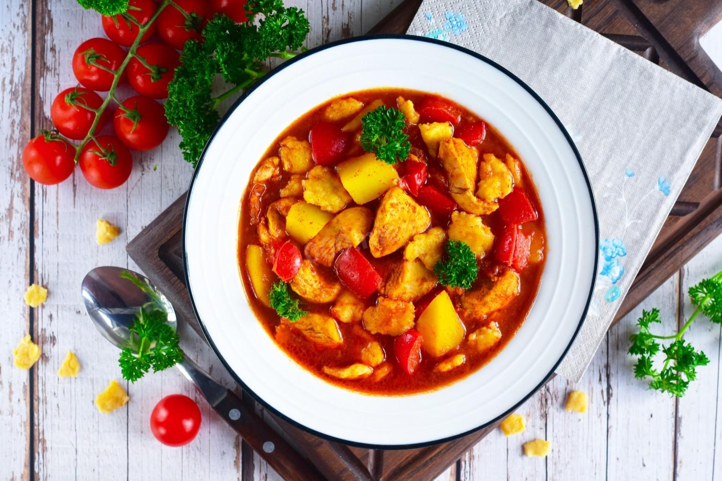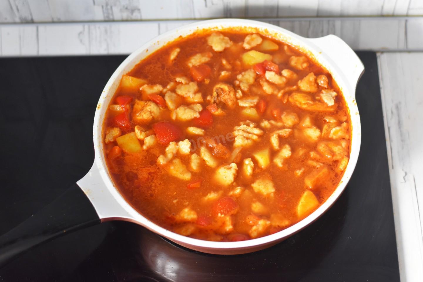 Włóż chipsy do gulaszu i gotuj przez 3-5 minut, aż wypłyną na powierzchnię. Od razu możesz podać gulasz do stołu. Smacznego!