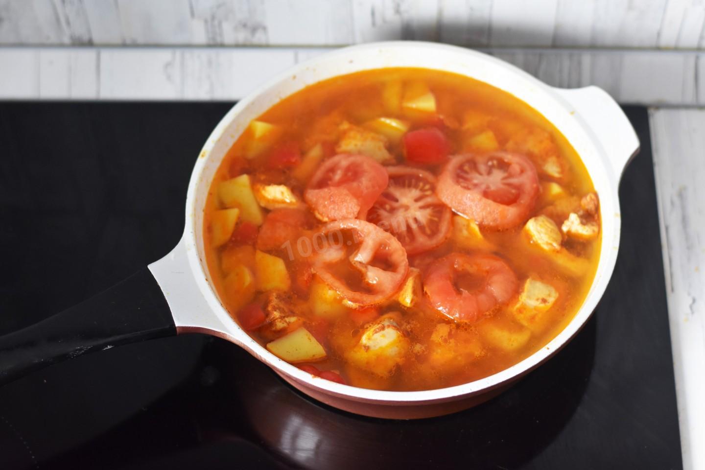 Umieść pokrojone pomidory na patelni. Wlej tyle gorącej wody, aby całkowicie przykryła mięso warzywami. Doprowadź wszystko do wrzenia i gotuj gulasz przez kolejne 10-15 minut, aż warzywa będą gotowe. Możesz dodać ilość wody do swoich upodobań, w zależności od pożądanej gęstości gotowego dania.