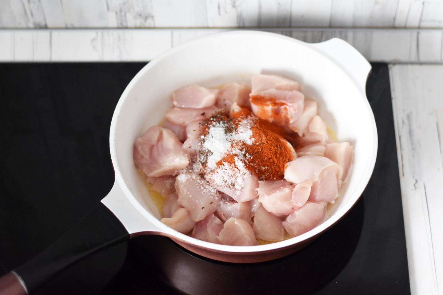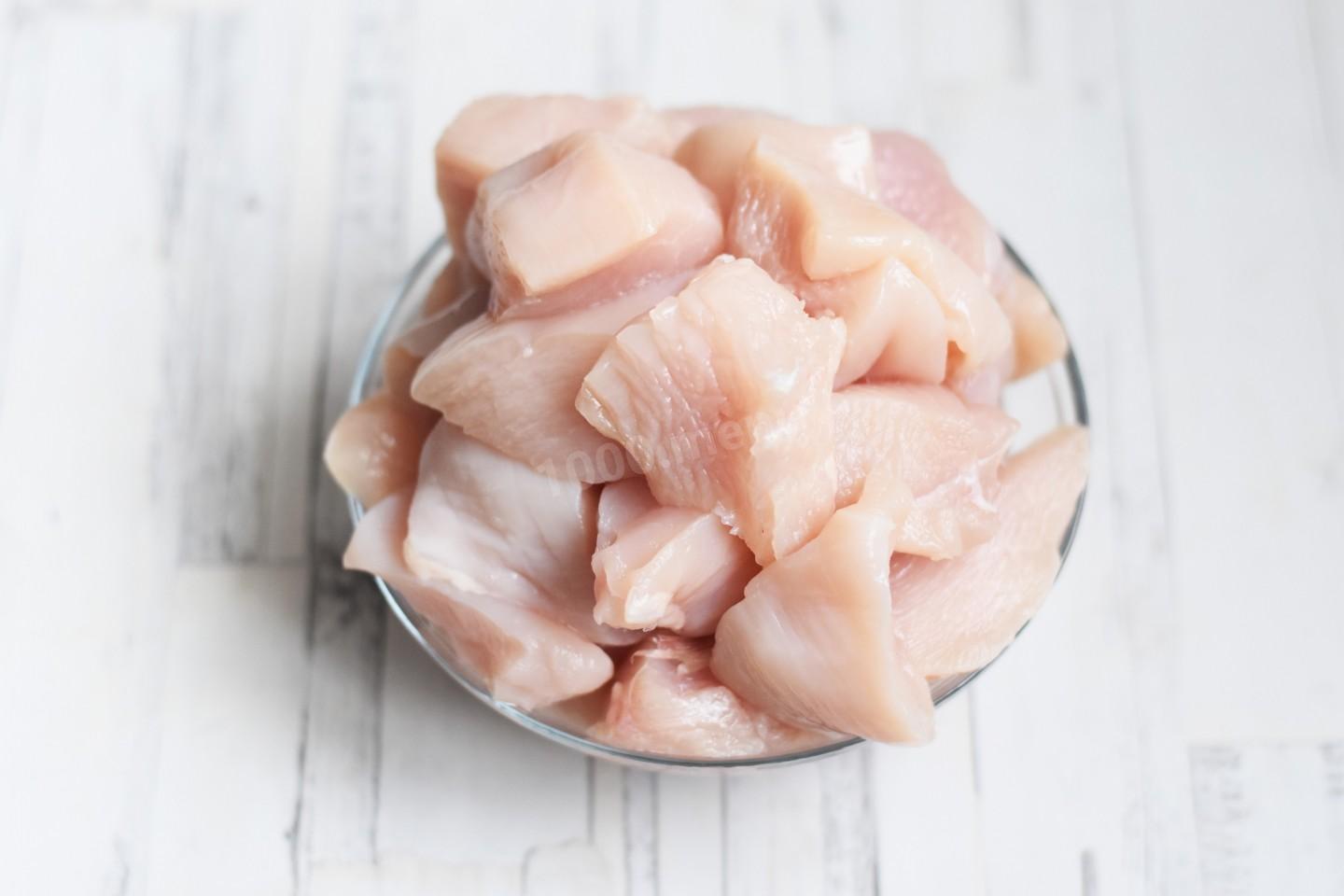 Filet z kurczaka umyć, osuszyć i pokroić na średnie kawałki.