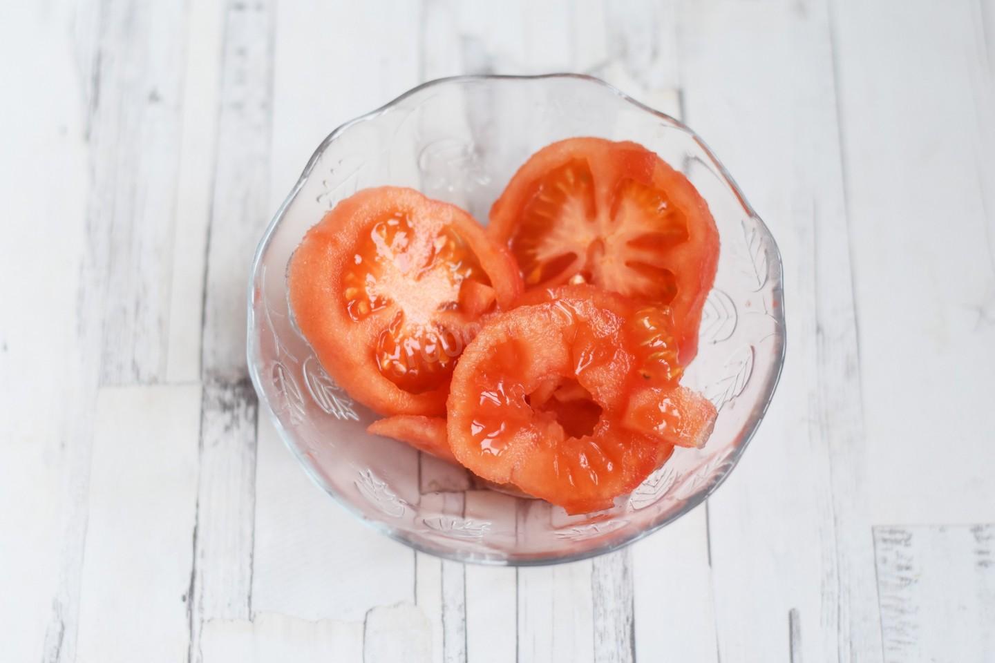 Obierz pomidora i pokrój w plasterki. Jak łatwo usunąć skórkę z pomidorów? Umyj je, wykonaj nacięcia na krzyż ostrym nożem. Zanurz we wrzącej wodzie na 1-2 minuty. Wyjmij, lekko ostudź i zdejmij skórkę.