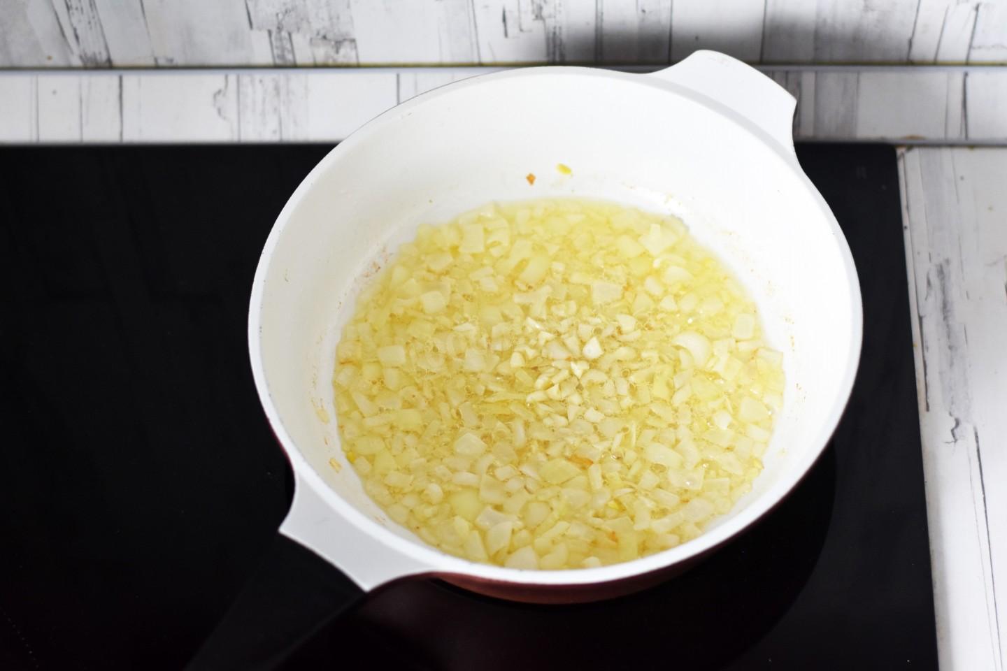 Na dużej głębokiej patelni z grubym dnem na małym ogniu rozgrzej olej roślinny. Cebulę ułożyć i smażyć, mieszając, na złoty kolor. Dodaj czosnek i smaż wszystko razem jeszcze przez 1 minutę, aż czosnek zacznie pachnieć jasno. Jeśli nie masz w swoim arsenale dużej patelni, możesz ją zastąpić patelnią.