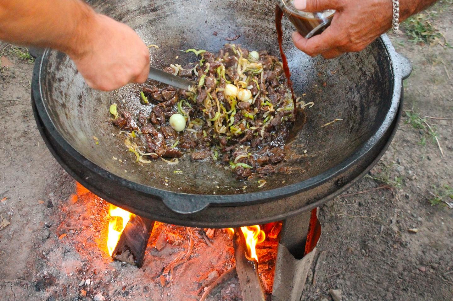 Wrzuć drewno do ognia, spraw, by ogień był silny. Wyślij paprykę, cebulę i czosnek do kotła.