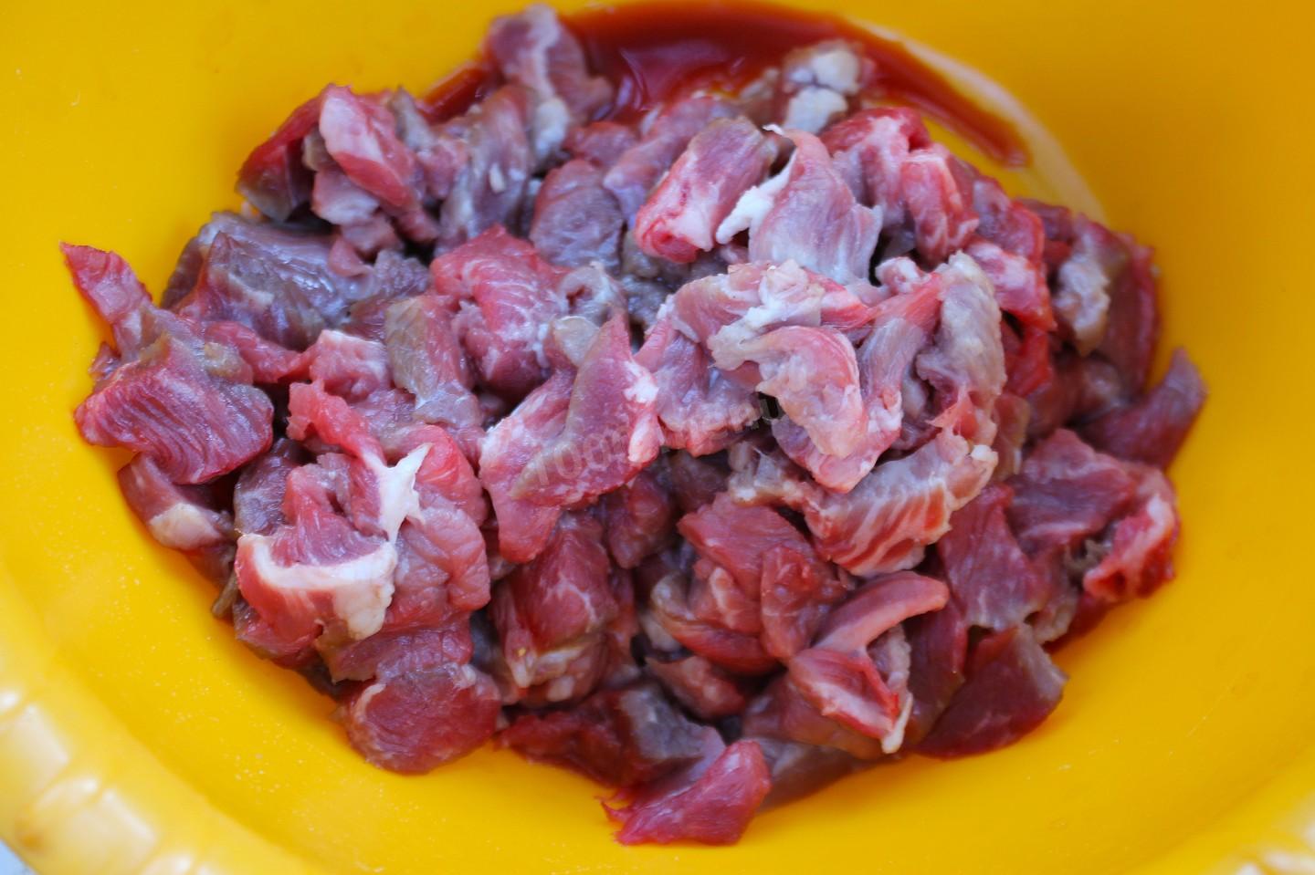 Aby wygodniej było pokroić mięso, wyślij je na chwilę do zamrażarki, aby filet był lekko zamrożony, a następnie łatwo pokrój wołowinę na te same małe kawałki.