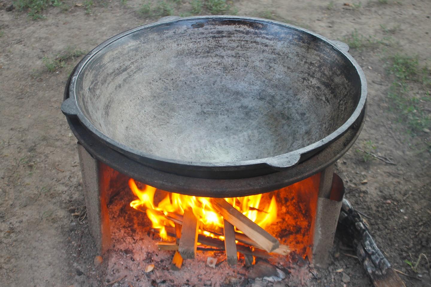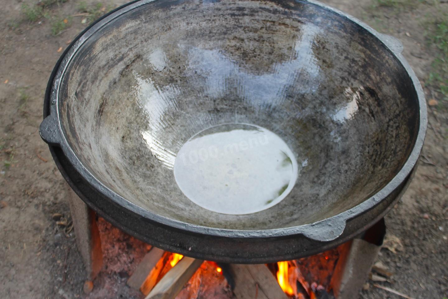 Wlej olej roślinny do kotła i rozgrzej go. Posmaruj brzegi kotła olejem, aby podczas dalszego smażenia kawałki mięsa nie przykleiły się do ścian naczyń. Utrzymuj ognisko pod kotłem na maksimum.