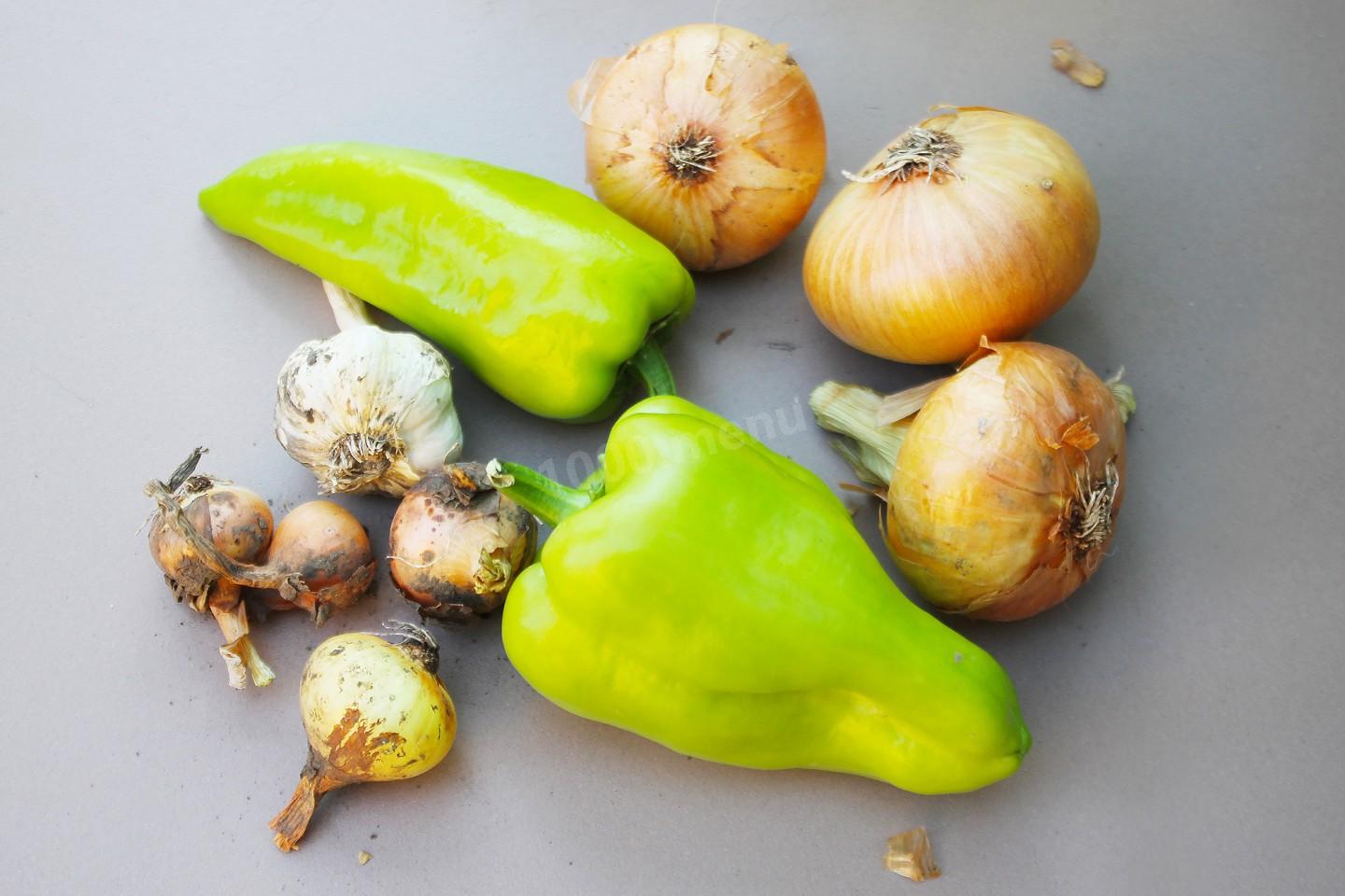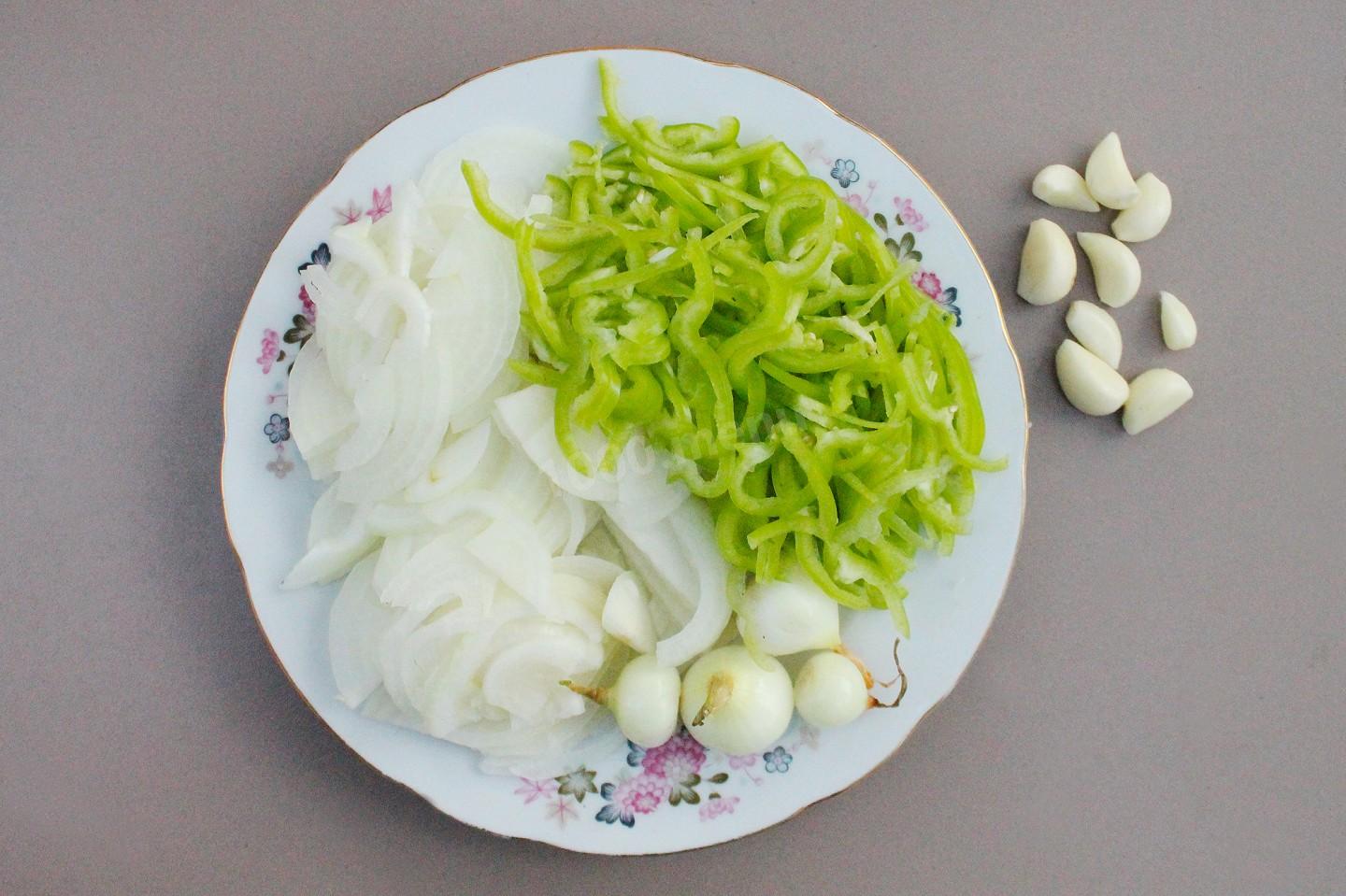 Przygotuj resztę składników w ten sam sposób. Użyłem cebuli, papryki i czosnku. W razie potrzeby możesz wziąć ostrą paprykę (nasze danie było przeznaczone dla dzieci, więc tym razem obyliśmy się bez niego).