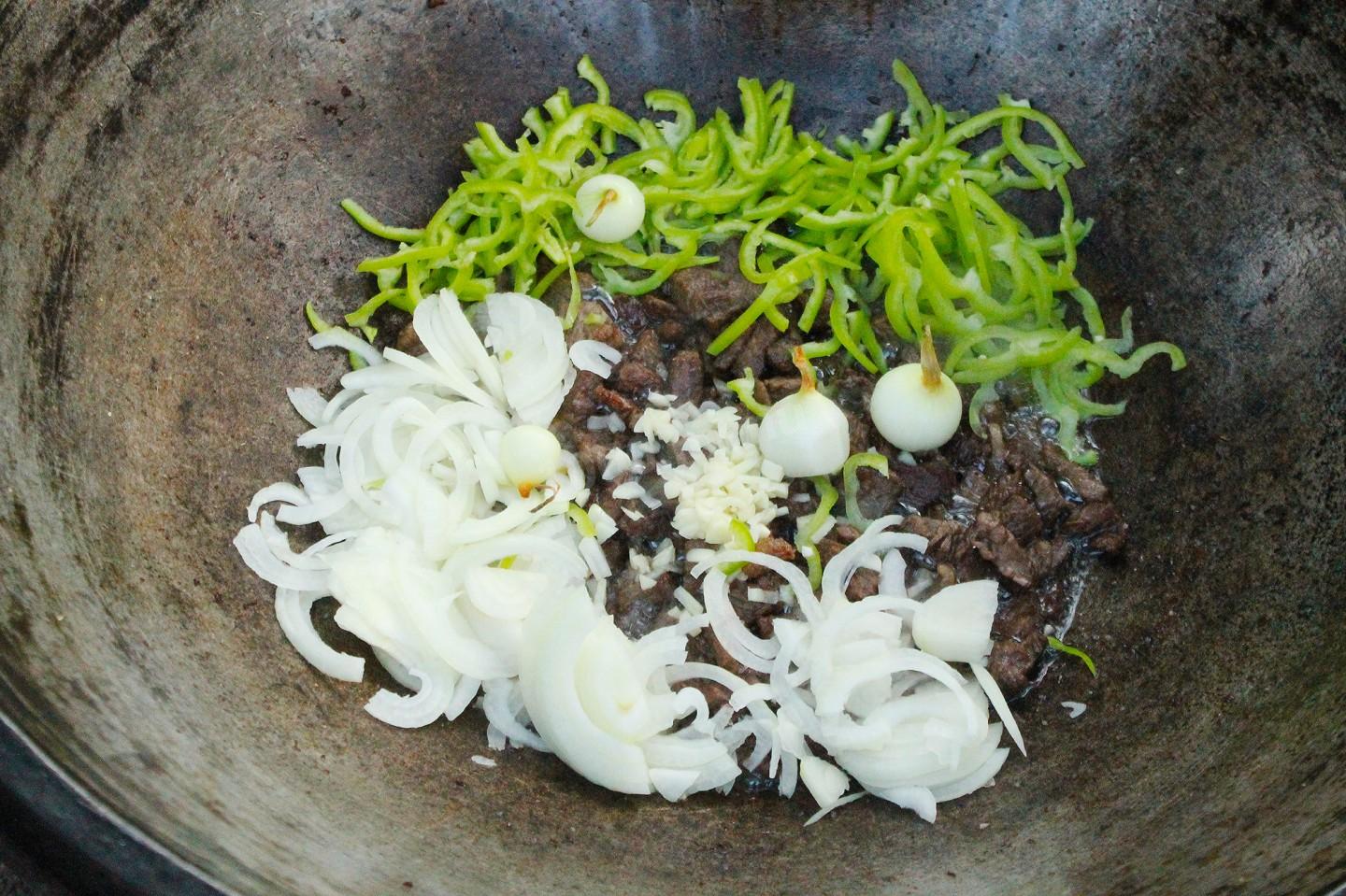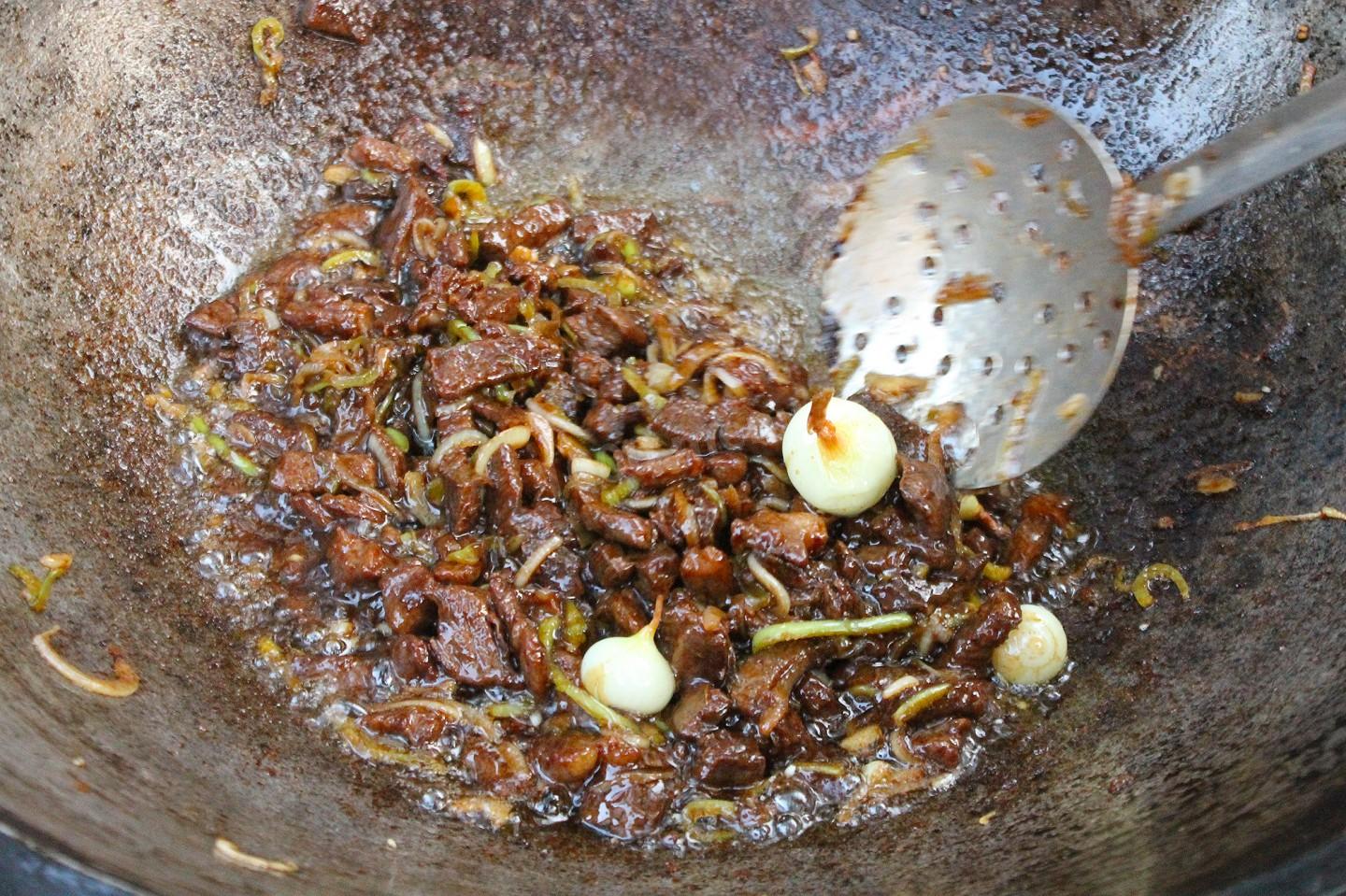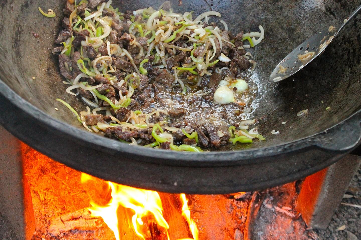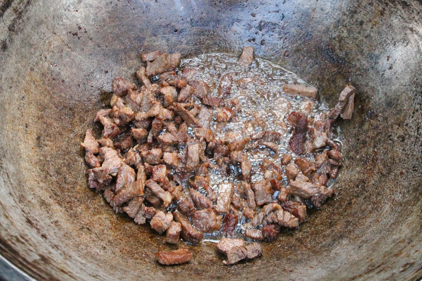 Następnie zrób ognisko pod kotłem nieco poniżej średniej i smaż mięso, aż będzie ugotowane, czasami mieszając. Ponieważ kawałki są małe, szybko się ugotują (Zajęło mi to około 15 minut).