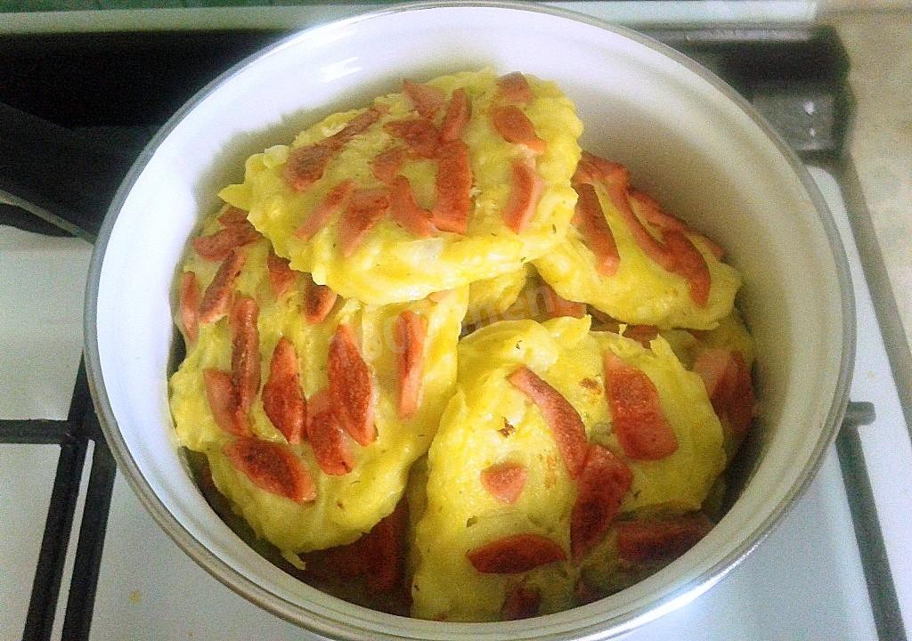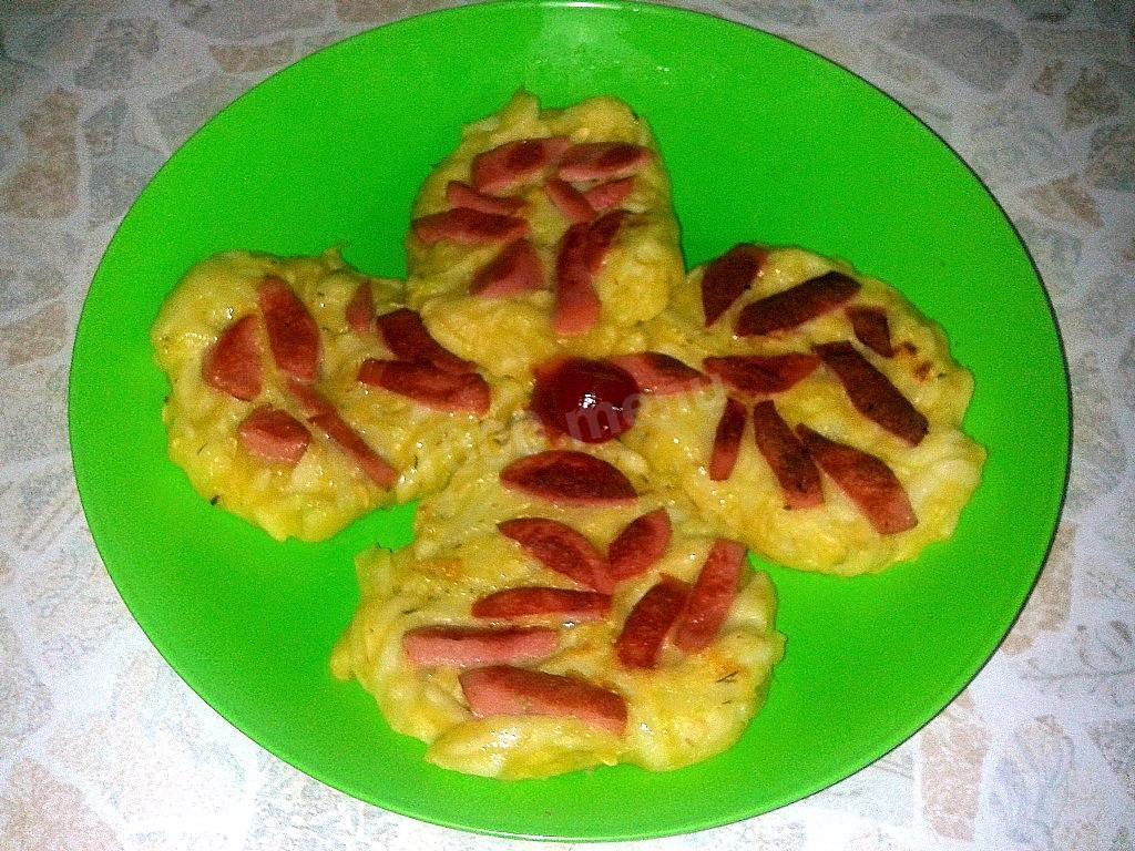 smaczniej jest jeść te placki na gorąco. Z sosów dobrze sprawdza się keczup. Zamiast kiełbasek można użyć gotowanej kiełbasy lub szynki.