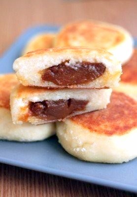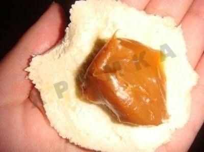 Zagnieść ciasto z semoliny, cukru i twarogu. Lekko zwilż ręce wodą, aby nasze ciasto się do nich nie przykleiło. Uformuj małe kółko ciasta, włóż do środka trochę gotowanego skondensowanego mleka.