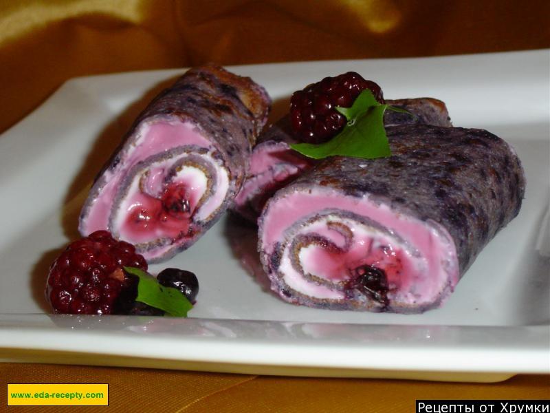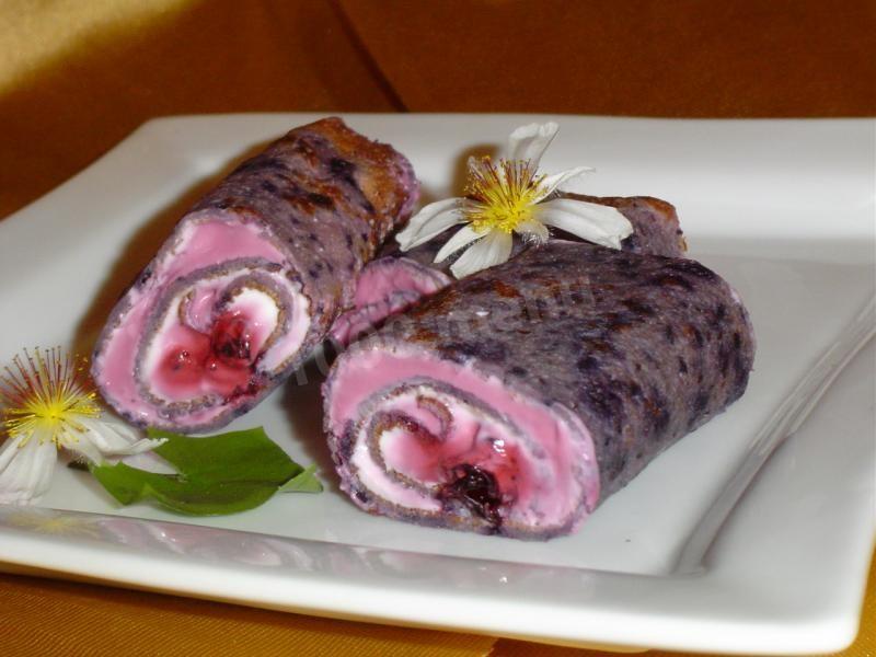 posmaruj każdy naleśnik kremem z twarogu i śmietany. Na wierzchu posmaruj kremem z jagodami. Połóż jagody na krawędzi, Zwiń naleśnik w rolkę.