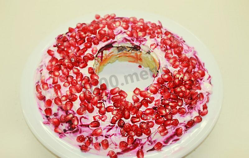 Sałatka z granatu z kurczakiem jest gotowa. Wyciągamy pierścień kulinarny.